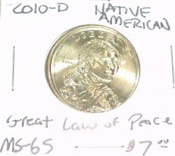 2010-D NATIVE AMERICAN $1 COIN RED BOOK VALUE IS $7.00 *RARE MS-65 HIGH GRADE GREAT LAW OF PEACE*!! ***Coin, Currency & All Items Listed in this auction - Grades, Conditions and Values are not Safe Deposit Coins LLC Responsibilty. Grades, Condition and Values are determined by Consigner(s) & Buyers ONLY