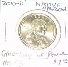 2010-D NATIVE AMERICAN *GREAT LAW OF PEACE* DOLLAR RED BOOK VALUE IS $7.00 *RARE MS-65 HIGH GRADE*!! ***Coin, Currency & All Items Listed in this auction - Grades, Conditions and Values are not Safe Deposit Coins LLC Responsibilty. Grades, Condition and Values are determined by Consigner(s) & Buyers ONLY***
