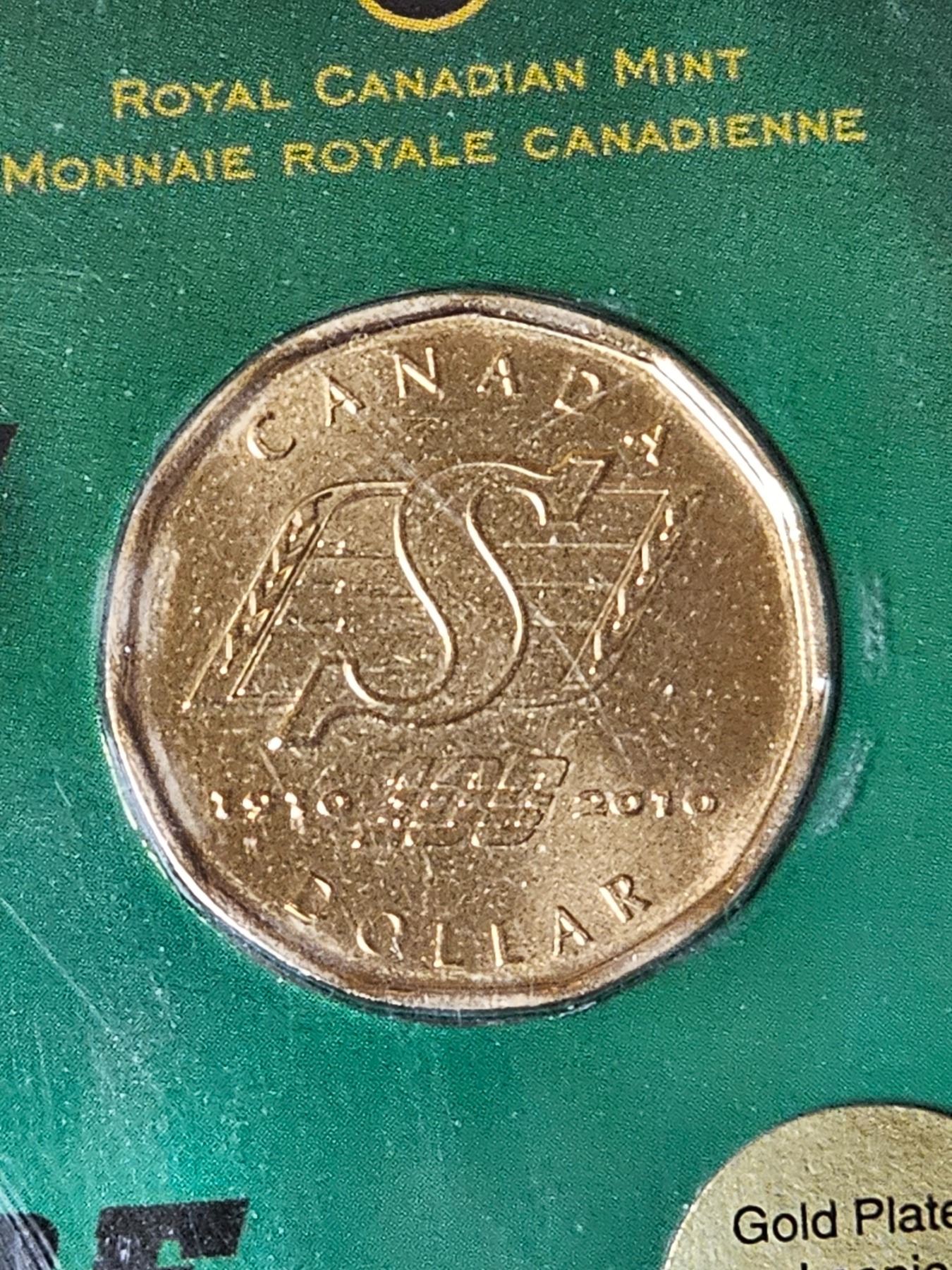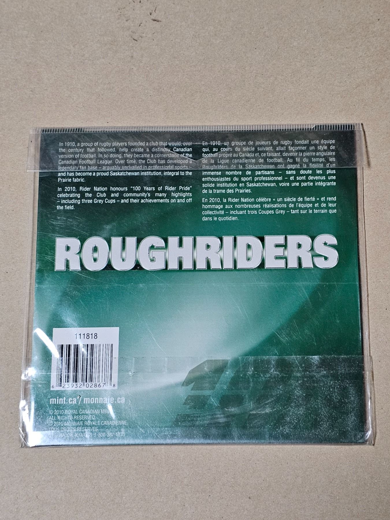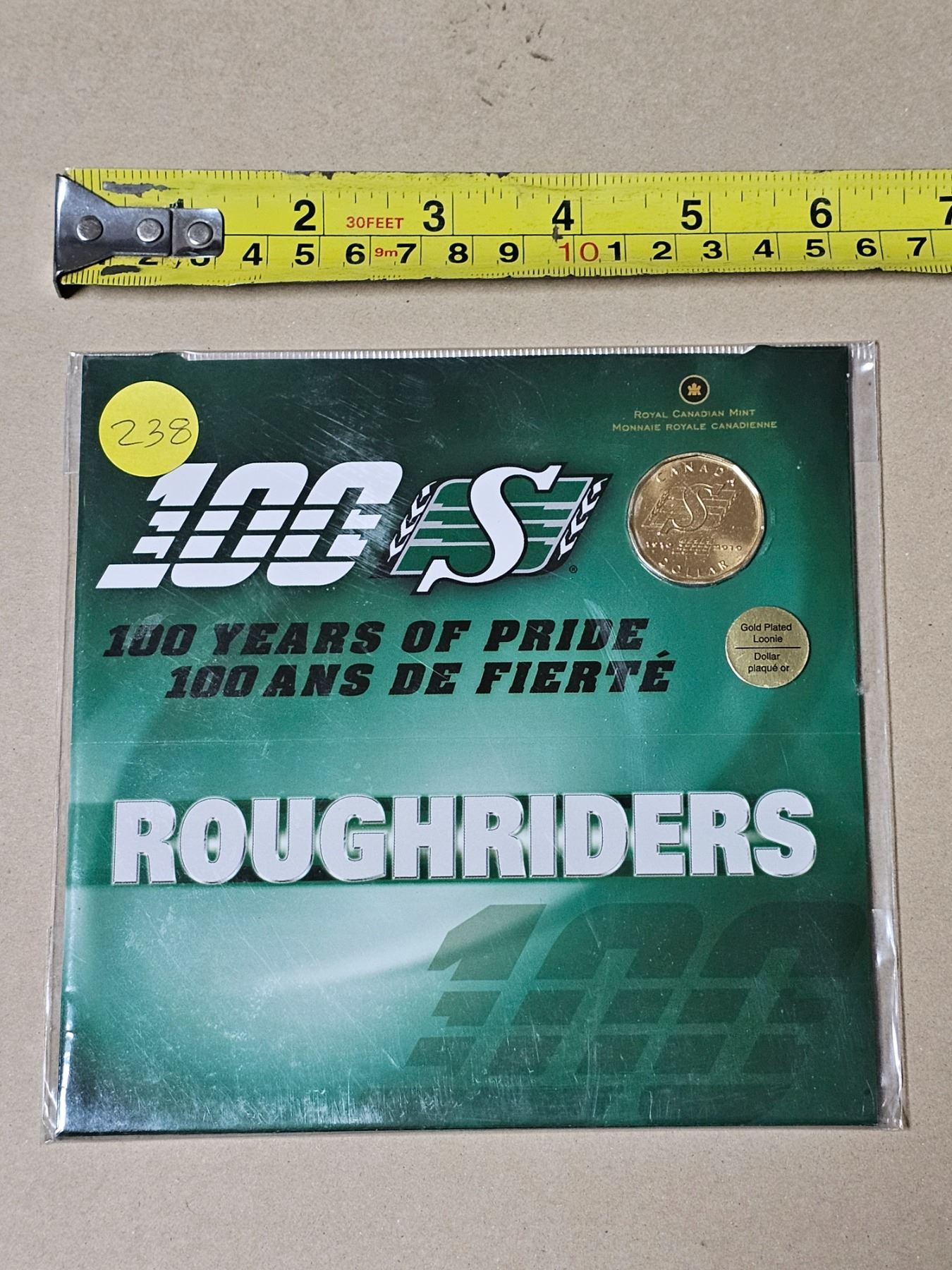 2010 Gold Plated One Dollar Coin "Sask Roughriders: 100 Years of Pride" Uncirculated. Royal Canadian Mint