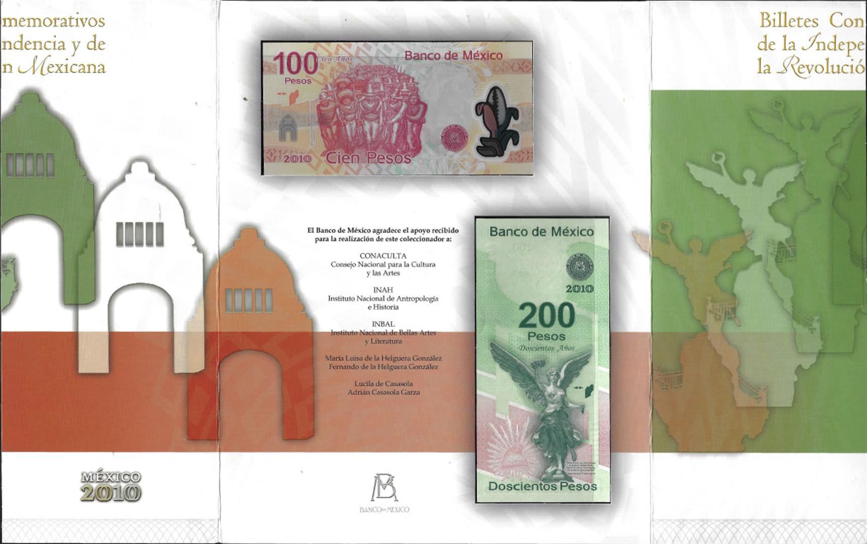 2010 Mexico 100 & 200 Pesos Commemorative Uncirculated Bank Notes in Folder