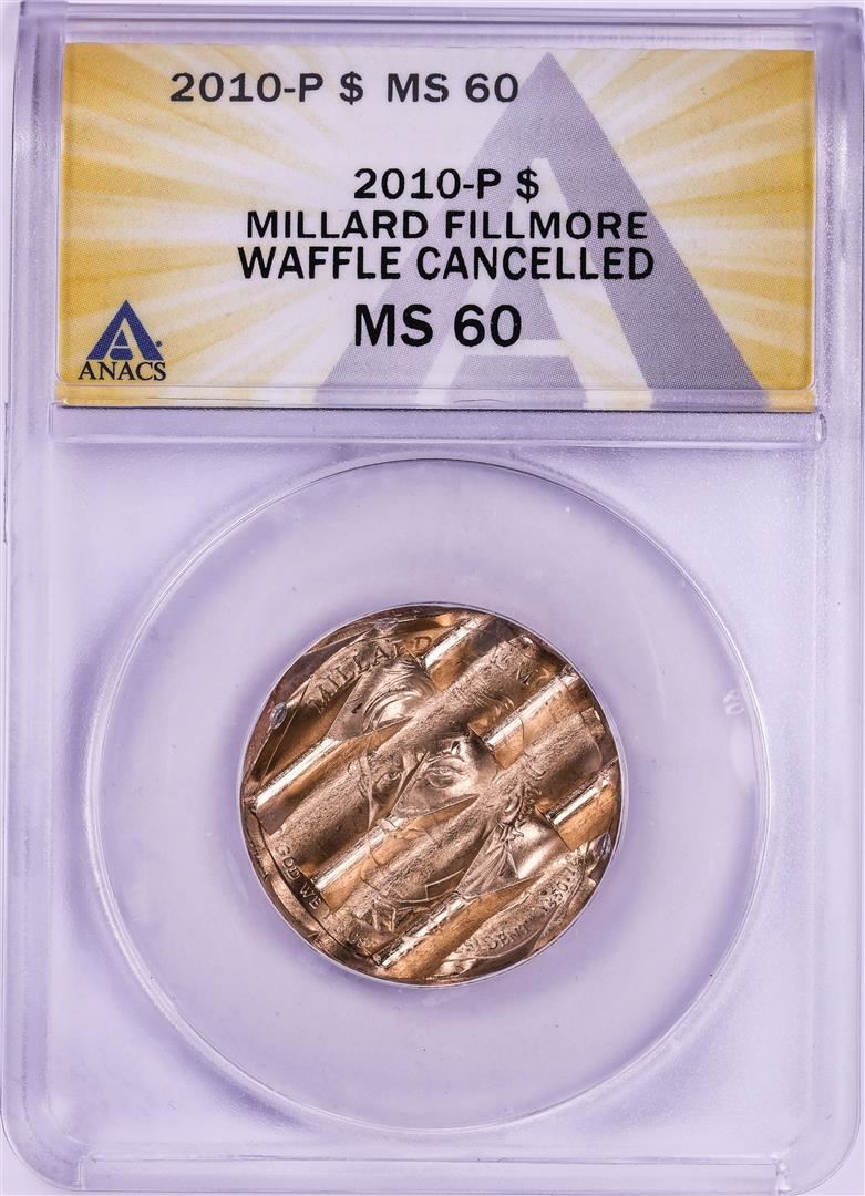 One 2010-P Millard Fillmore Presidential Dollar Waffle Cancelled Coin ANACS MS60. ANACS Certified.