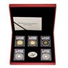 This Prestige Panda First Strike Set consists of a complete five coin set of the 2010 China Panda bullion gold coins and a lunar Tiger colorized silver medallion. Each 1oz, 1/2oz, 1/4oz, 1/10oz, and 1/20oz gold coin and the 1oz silver medal are of 99.9% fineness. All coins have been issued by the People's Bank of China, minted by the Shenzhen Guobao Mint Limited, and distributed by China Great Wall Coins Investments Limited. The obverse side of each Panda gold coin depicts the Prayer Hall in the Temple in the Temple of Heaven; while the reverse features two lovable pandas. Shown on the obverse of the silver medallion, is the House of Scent on the Summer Palace; while the reverse displays a colorized portrait of two tigers in the wild. All coins have been graded by PCGS. PCGS Certified.