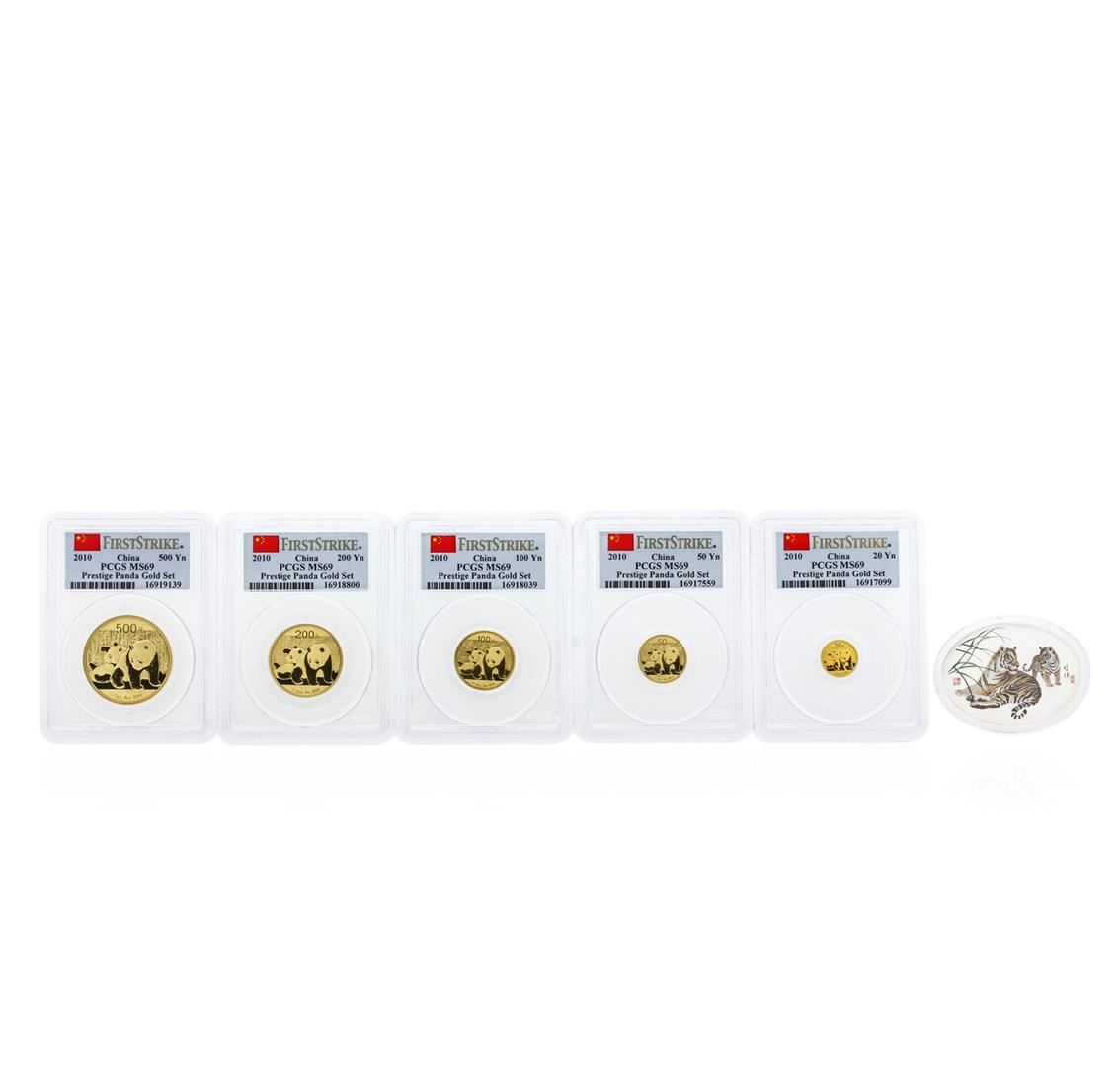 This Prestige Panda First Strike Set consists of a complete five coin set of the 2010 China Panda bullion gold coins and a lunar Tiger colorized silver medallion. Each 1oz, 1/2oz, 1/4oz, 1/10oz, and 1/20oz gold coin and the 1oz silver medal are of 99.9% fineness. All coins have been issued by the People's Bank of China, minted by the Shenzhen Guobao Mint Limited, and distributed by China Great Wall Coins Investments Limited. The obverse side of each Panda gold coin depicts the Prayer Hall in the Temple in the Temple of Heaven; while the reverse features two lovable pandas. Shown on the obverse of the silver medallion, is the House of Scent on the Summer Palace; while the reverse displays a colorized portrait of two tigers in the wild. All coins have been graded by PCGS. PCGS Certified.