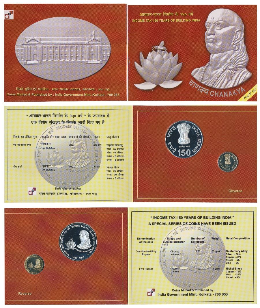 2010 Proof Set, Income Tax 150 years of building India, Chanakya, set of 2, Rupees 5 and 150. In immaculate condition, within original packaging. (2)
