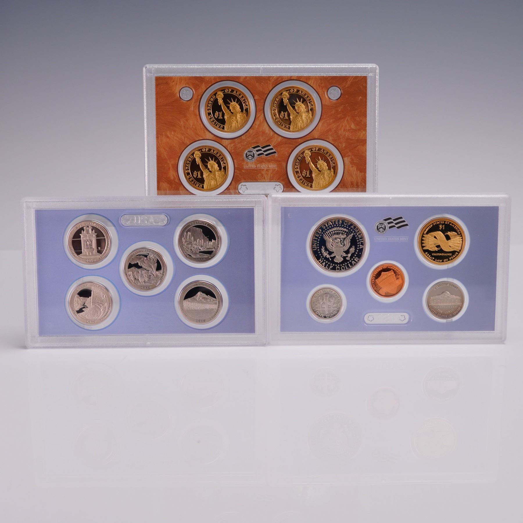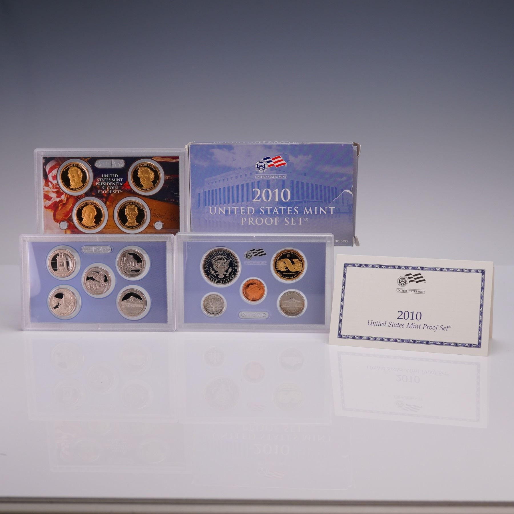 A 2010-S United States Mint Proof Set comprising fourteen coins struck at the San Francisco Mint, each bearing the "S" mintmark and rendered in brilliant proof finish. The set includes the standard cent, nickel, dime, Kennedy half dollar, and Native American dollar, along with the five America the Beautiful quarters commemorating Hot Springs, Yellowstone, Yosemite, Grand Canyon, and Mount Hood National Parks. Also included are four Presidential dollar coins honoring Millard Fillmore, Franklin Pierce, James Buchanan, and Abraham Lincoln. Encased in three clear plastic lenses for preservation and display. This item has its original box. Box measures: 5.5"L x 3.5"W x 1"H. Certificate of Authenticity included.