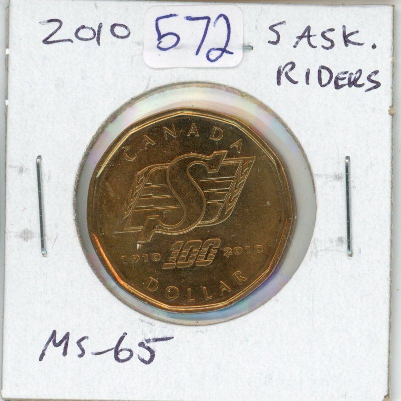 2010 Saskatchewan Roughriders Loonie. MS-65 from an original roll.