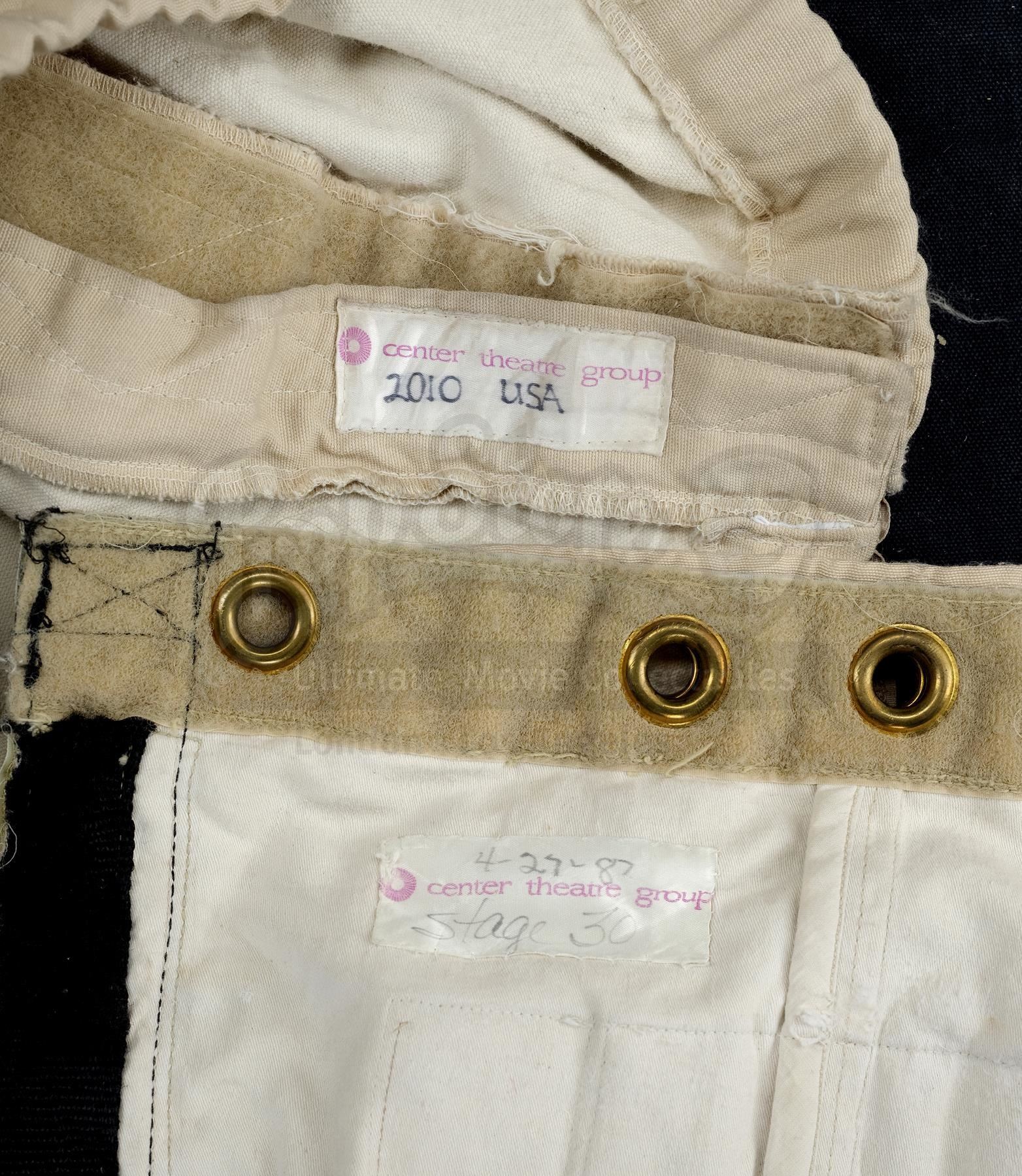 This cream-coloured polyester spacesuit comprises a jacket, a pair of trousers, a pair of boots, and one glove. Some components are labeled for the Center Theatre Group, who likely created the costume. The jacket has multiple pockets, metal eyelets, a stuffed-polyester tube, and a Velcro enclosure. The arms feature three red nylon stripes (left) and an embroidered American flag patch (right). The waist and inseams of the trousers have Velcro enclosures. The boots have metal snaps, Velcro backs, and white non-slip soles. The glove has a metal loop for tightening. The jacket is marked "4-27-82 Stage 30" and the trousers "2010 USA". The spacesuit exhibits wear, including rips, stains, and fabric pilling. The right glove is missing.