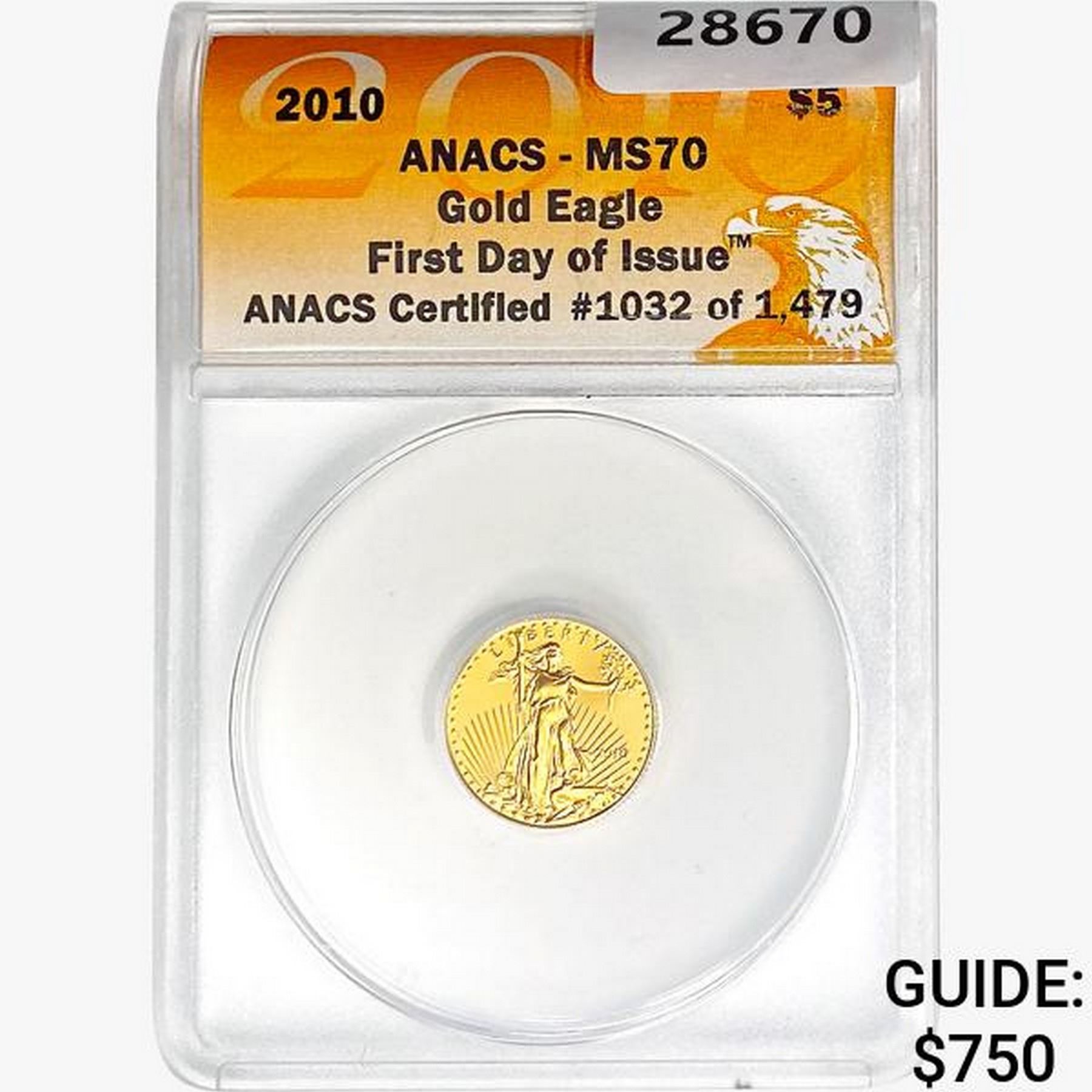 2010 US 1/10oz. Gold $5 Eagle ANACS MS70 FDI