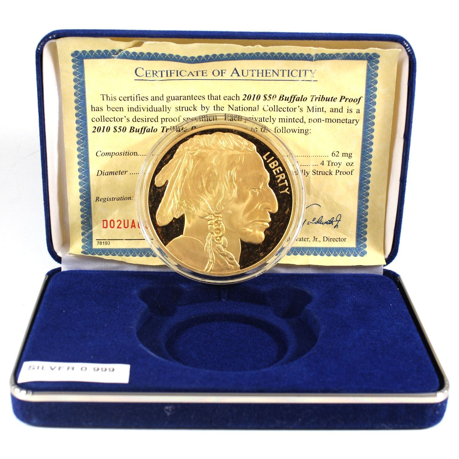 2010 USA $50 Buffalo Tribute Proof Gold Plated 4oz .999 Fine Silver Coin Encapsulated in Original Blue Display Box with COA (capsule has light scratches & COA is tattered). TAX Exempt.