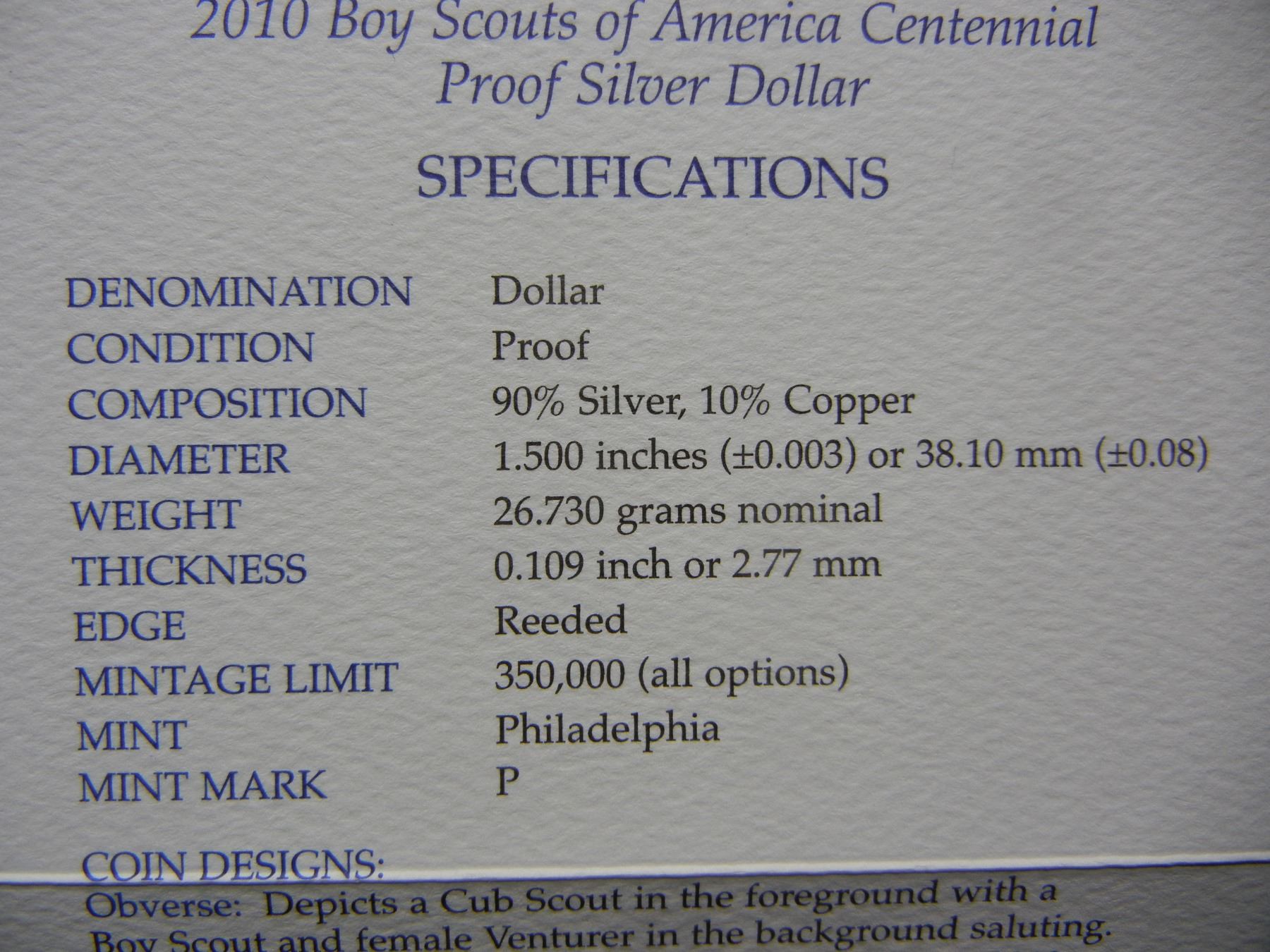 2010 United States Boy Scouts of America BSA Centennial Proof Silver Dollar in Original Packaging