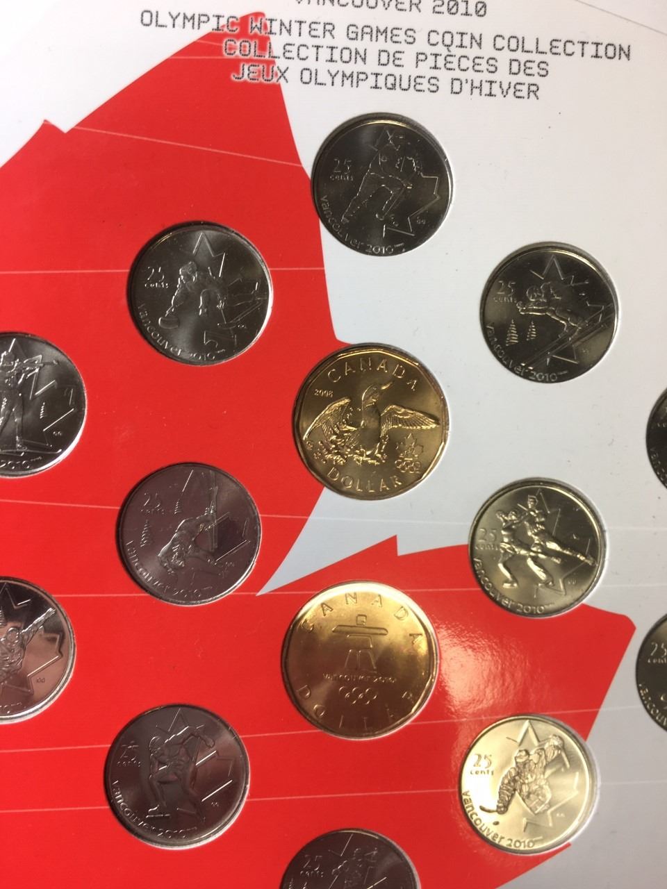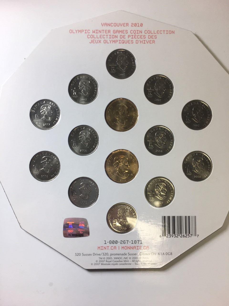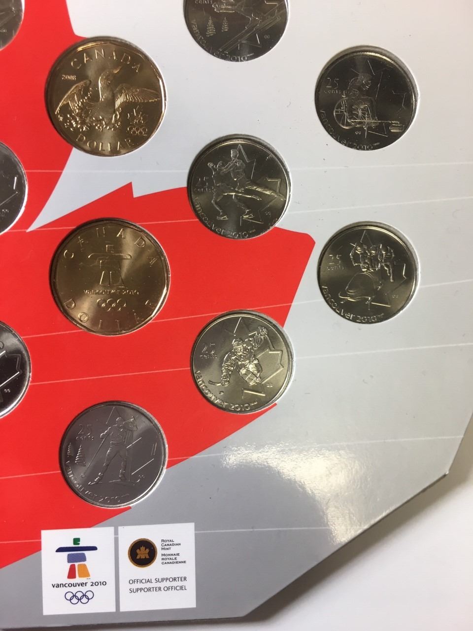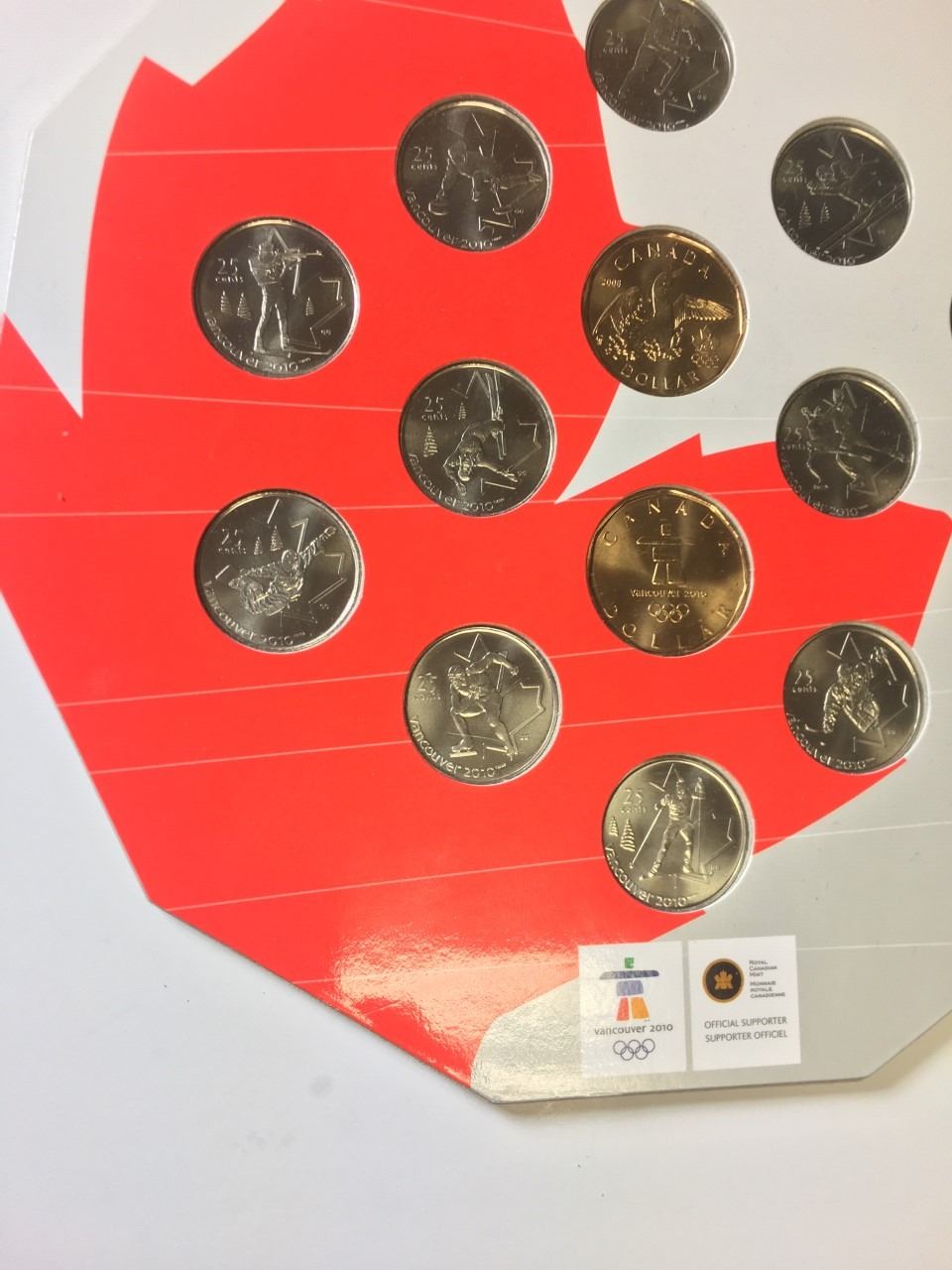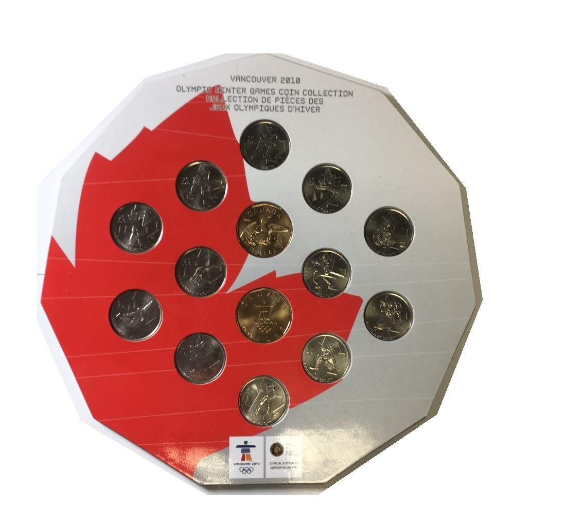 The coins showcase all twelve 25 Cent Vancouver 2010 designs, and 2 Lucky Loonie designs. Packaging is in a hendecagon shape. (11 sided)