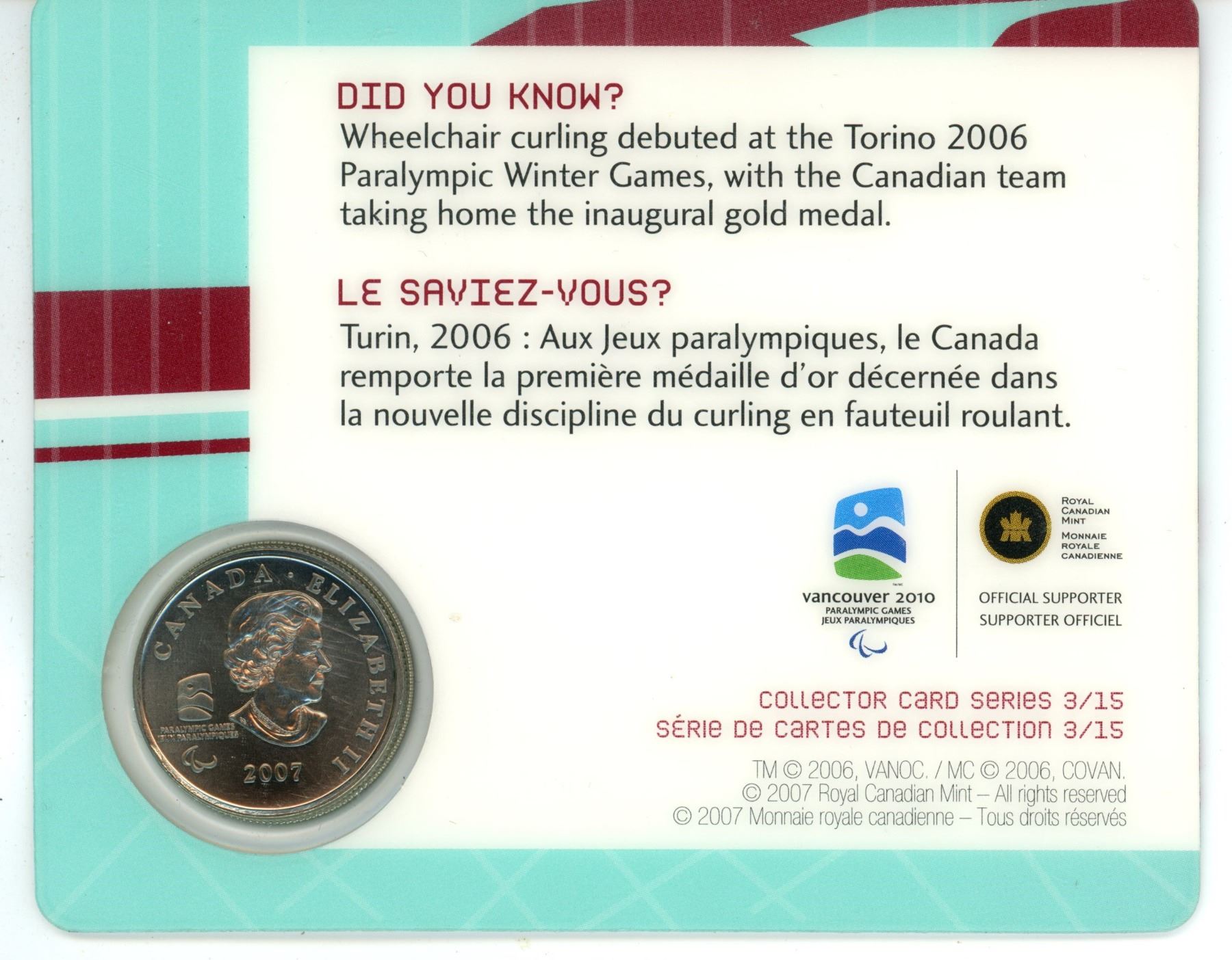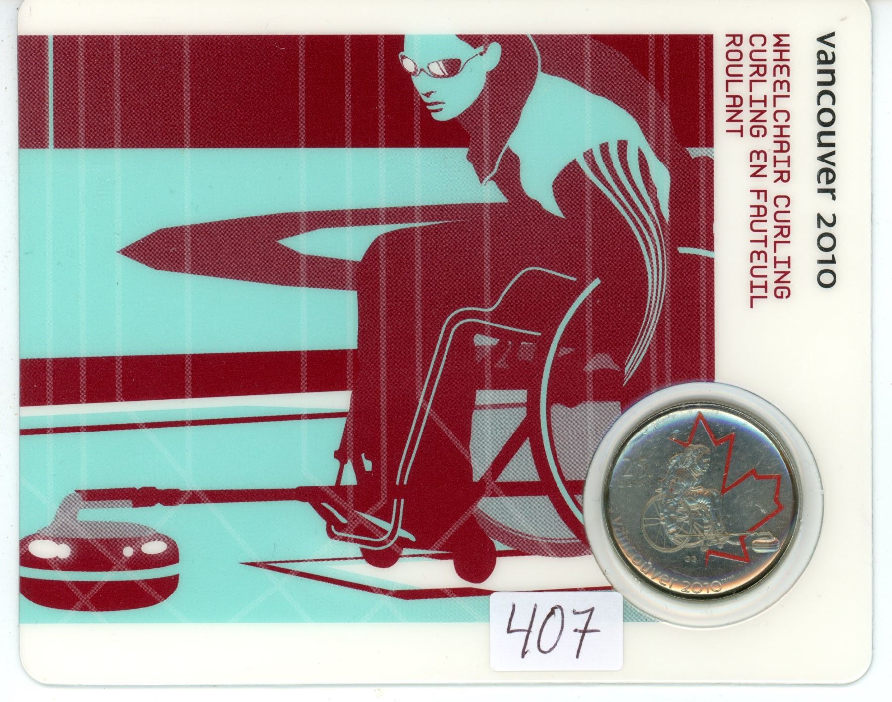 2010 Vancouver Winter Olympic Games Sports Card with 2007 Colourized Wheelchair Curling 25 Cents.