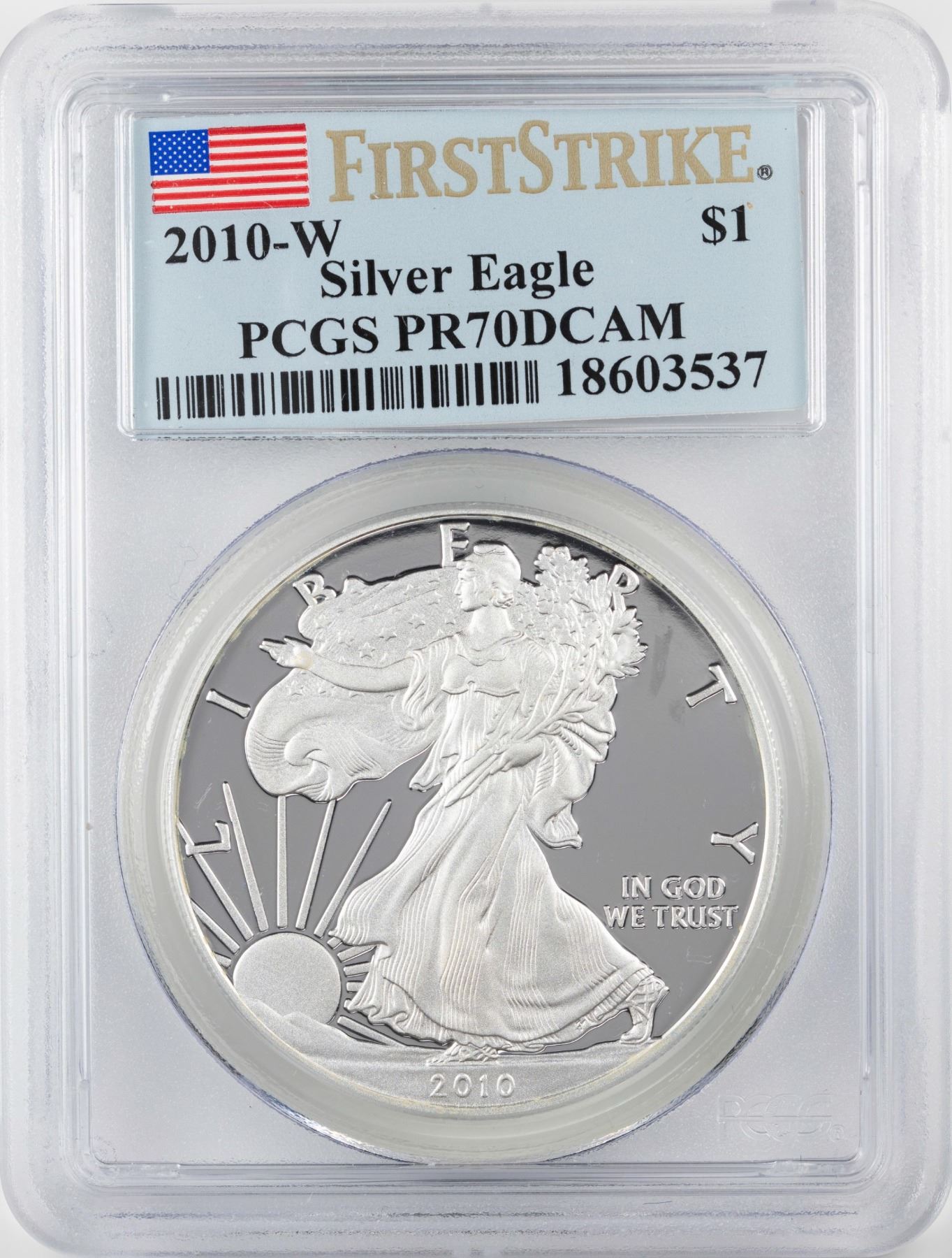 One 2010-W $1 Proof American Silver Eagle Coin PCGS PR70DCAM First Strike.