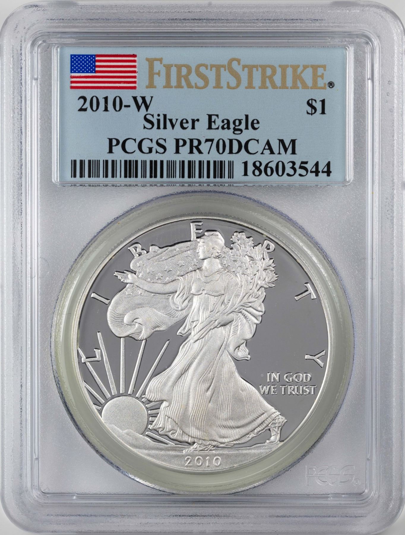 One 2010-W $1 Proof American Silver Eagle Coin PCGS PR70DCAM First Strike.