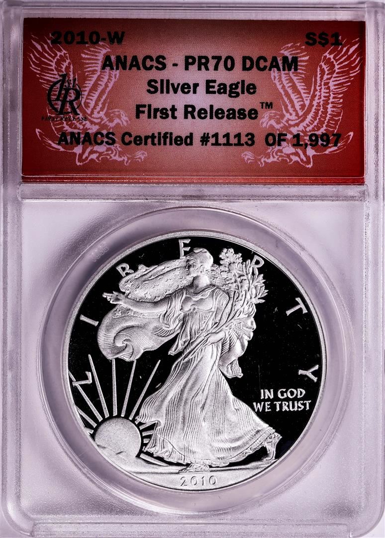 One 2010-W $1 Proof Silver Eagle Coin ANACS PR70DCAM First Release. ANACS Certified.