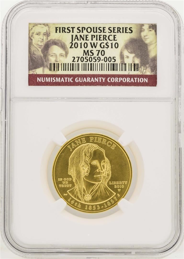 One 2010-W $10 First Spouse Series Jane Pierce Gold Coin NGC MS70. NGC Certified.