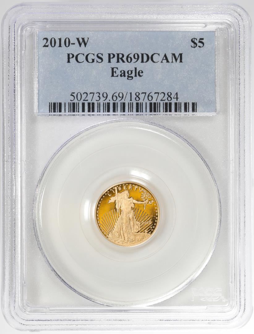 One 2010-W $5 Proof American Gold Eagle Coin PCGS PR69DCAM. PCGS Graded.