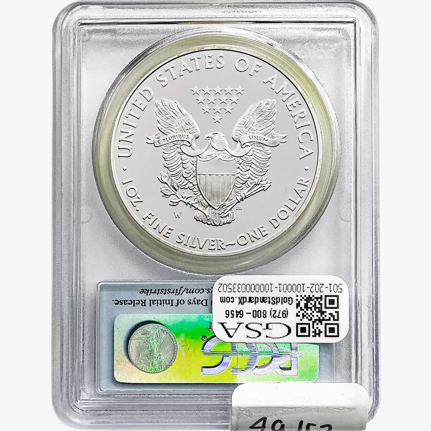 COINS AND CURRENCY LISTED IN GSA’S CATALOG AS GRADED AND ENCAPSULATED BY PCGS, NGC, ANACS, ICG, PCGS CURRENCY, PMG, PCGS BANKNOTE GRADING, CMC OR ANY OTHER THIRD-PARTY GRADING SERVICE ARE LIKEWISE SOLD “AS-IS” EXCEPT AS EXPRESSLY SET FORTH HEREIN. ALL THIRD-PARTY GRADING SERVICE GUARANTEES, INCLUDING AUTHENTICITY, ARE THE SOLE RESPONSIBILITY OF THE THIRD-PARTY GRADING SERVICE AND NOT WARRANTIES OR GUARANTEES OF GSA. BIDDERS SHOULD CONTACT THESE THIRD-PARTY GRADING SERVICES DIRECTLY WITH RESPECT TO ANY CLAIMS OR QUESTIONS THEY MAY HAVE CONCERNING THEIR GUARANTEES AND WARRANTIES. BIDDERS ACKNOWLEDGE AND AGREE THAT AUCTIONEER IS NOT BOUND BY OR LIABLE FOR ANY OPINION OR CERTIFICATION BY ANY THIRD-PARTY GRADING SERVICE. REMOVAL OF A PRODUCT FROM ITS PROTECTIVE CASING OR HOLDER OR ALTERATION OF ANY COIN HOLDER WAIVES ALL RIGHTS CONCERNING THE PRODUCT CONTAINED THEREIN.