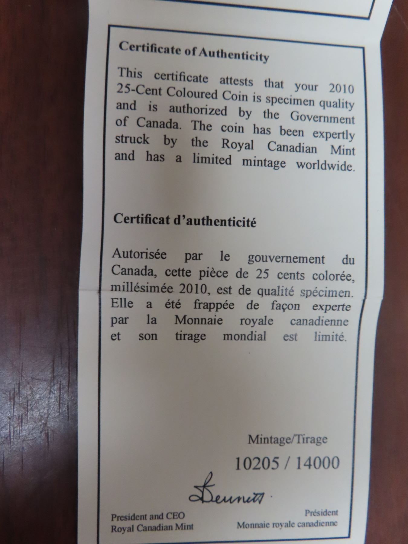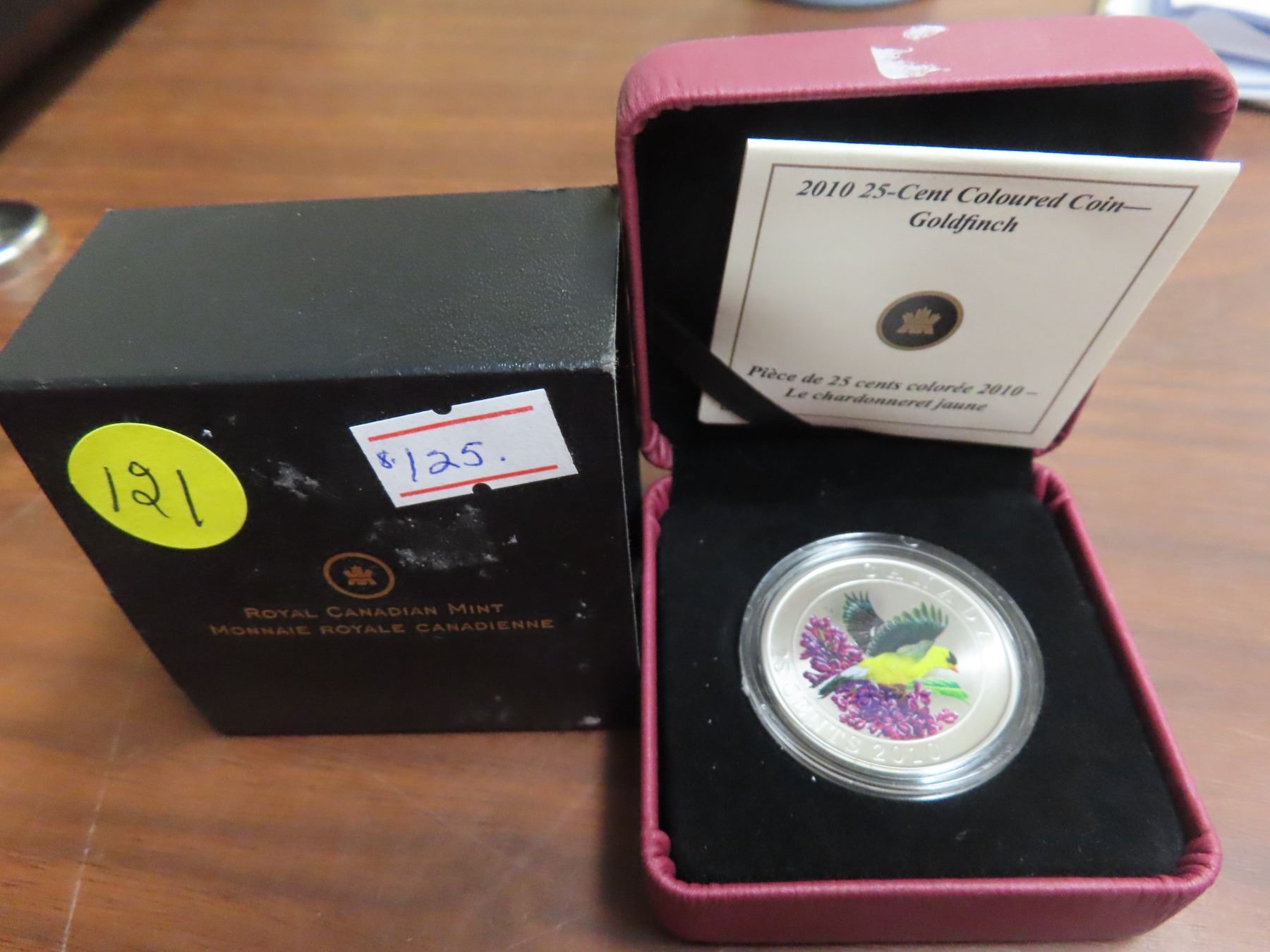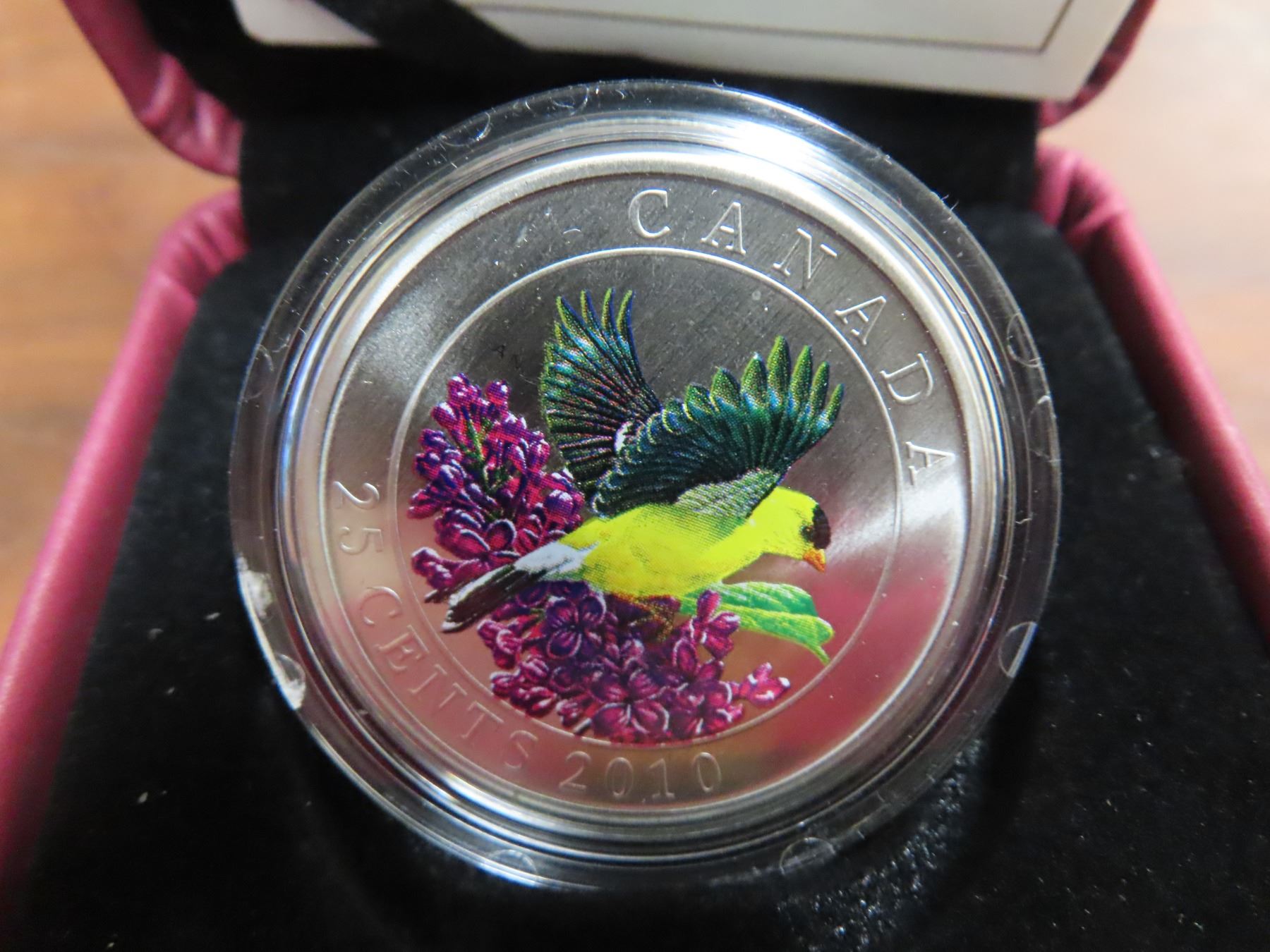 2010 -goldfinch canadian 25 cent coloured coin with certificate of authenticity
