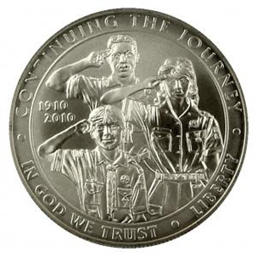 The 2010 Boy Scouts Silver Dollar was issued to celebrate the 100th anniversary of the founding of the Boy Scouts of America. PCGS lists ms70 at $125. This example is Graded ms70 by USCG. Estimated Value $75