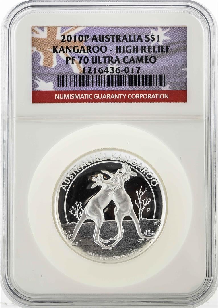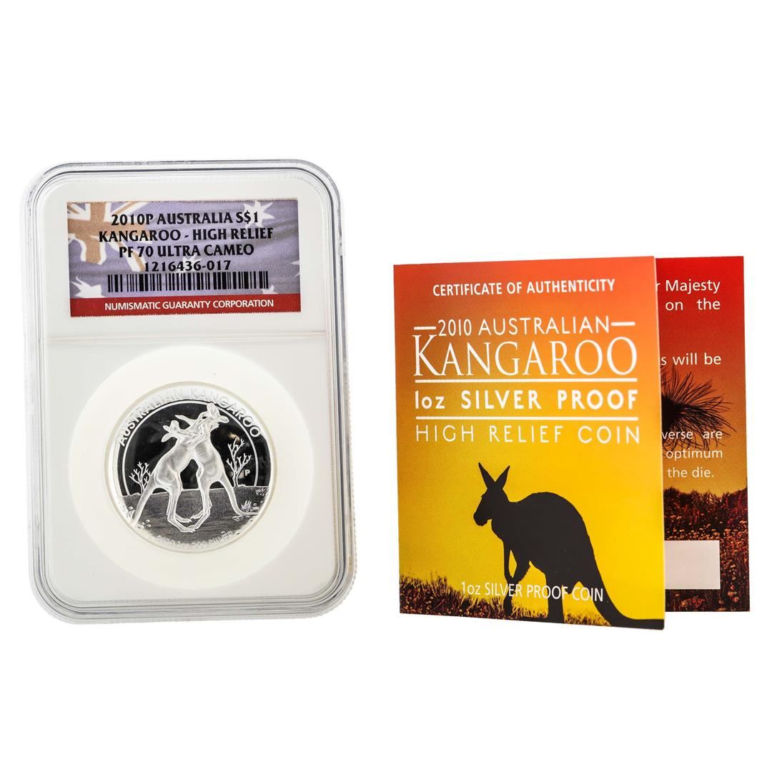 One 2010P $1 Australia Kangaroo High Relief Silver Coin NGC PF70 Ultra Cameo. NGC Certified.