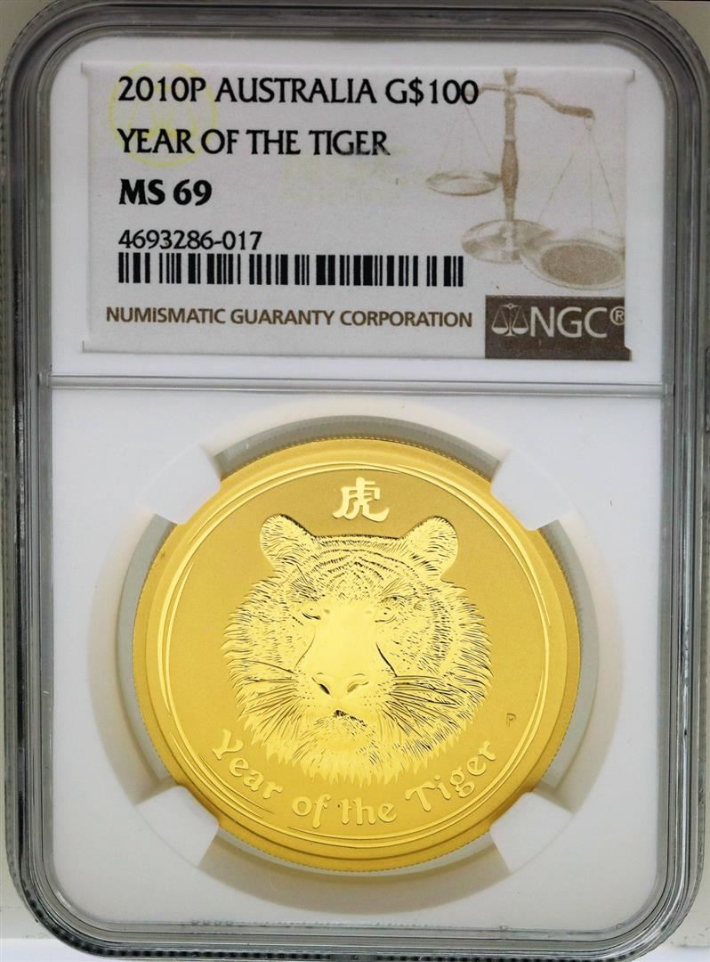 One 2010P Australia $100 Year of the Tiger Gold Coin NGC MS69. NGC Certified.