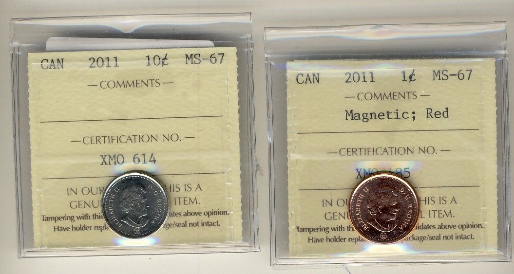 2011 1¢ & 10¢ ICCS MS67. Lot of 2 coins.