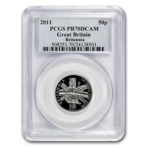 2011 1/4 oz Silver Britannia PR-70 DCAM PCGS Registry S **|**|** Population of just 9 coins! This 1/4 oz Silver Britannia coin is a Silver treasure for both its beauty and Silver value. Produced by the Royal Mint, the 2011 Silver Britannia coin is UK legal tender and has a face value of 50 pence. This beautiful example ; MSRP: $400