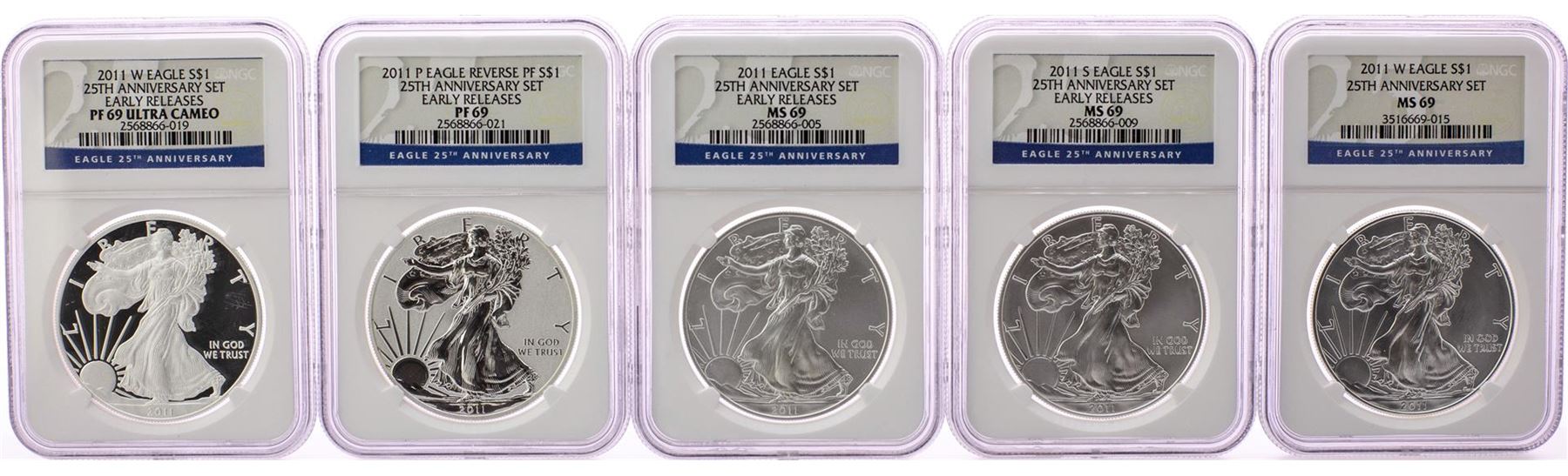 One 2011 $1 American Silver Eagle 25th Anniversary (5) Coin Set NGC MS69/PF69. NGC Certified.