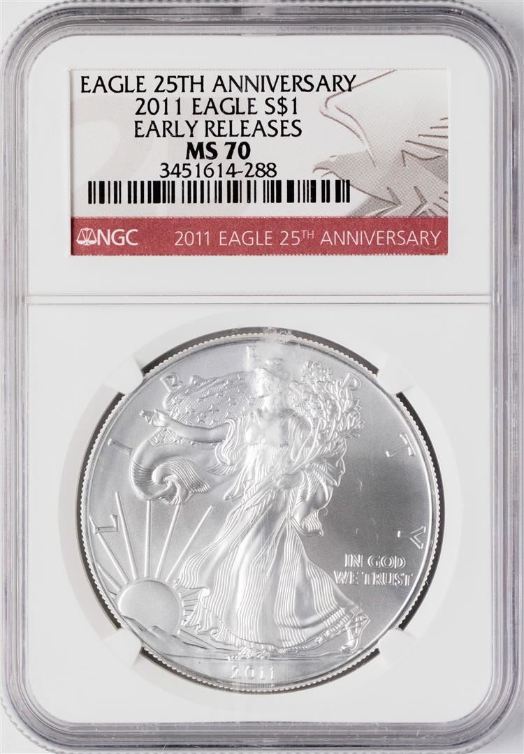 One 2011 $1 American Silver Eagle Coin NGC MS70 Early Releases. NGC Certified.