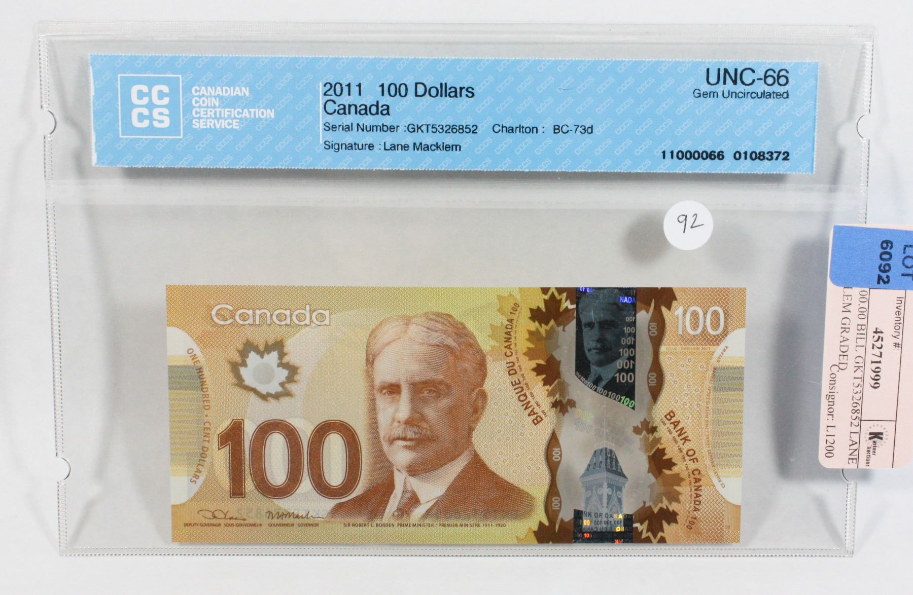 GEM UNCIRCULATED 66 BY C.C.C.S VERY HIGH GRADE. 2011 $100.00 Lane Macklem rarer signature of group incredible grade of Gem Uncirculated 66, greater value bill