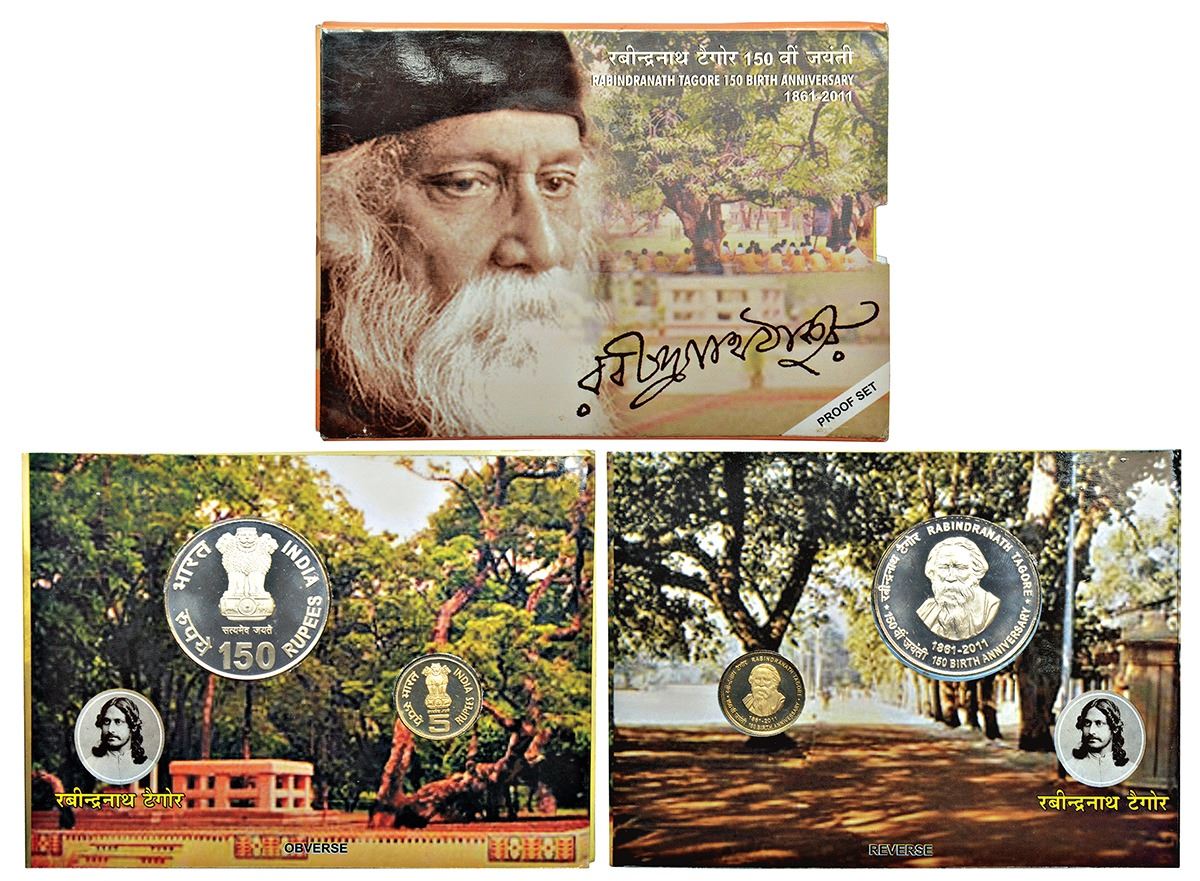 2011, 150th Birth Anniversary of Rabindranath Tagore, Proof set of 2 coins, 150 rupees and 5 rupees, Kolkata mint, RB 373, in original mint packing.