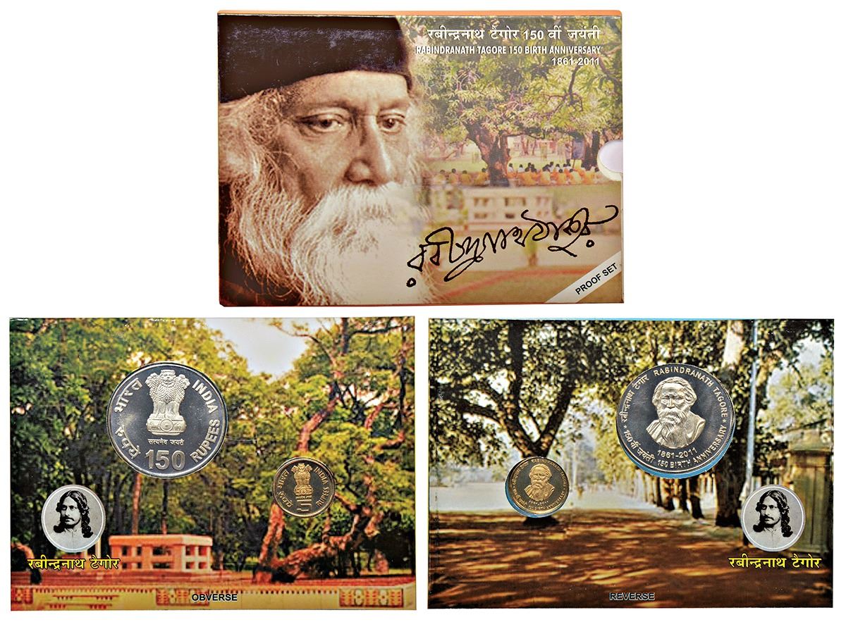 2011, 150th Birth Anniversary of Rabindranath Tagore, Proof set of 2 coins, 150 rupees and 5 rupees, Kolkata mint, RB 373, in original mint packing.