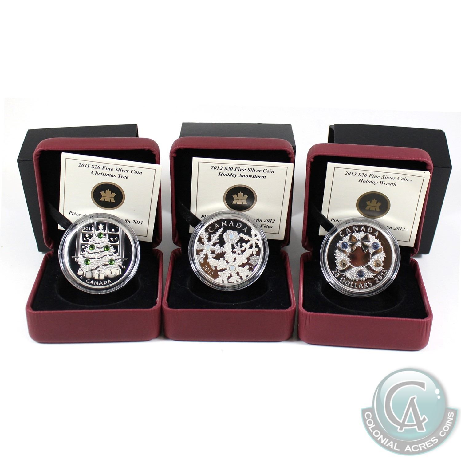 2011 $20 Christmas Tree, 2012 $20 Holiday Snowstorm & 2013 $20 Holiday Wreath Fine Silver coins (Tax Exempt). Capsules are lightly scuffed and sleeve coming unglued. 3pcs