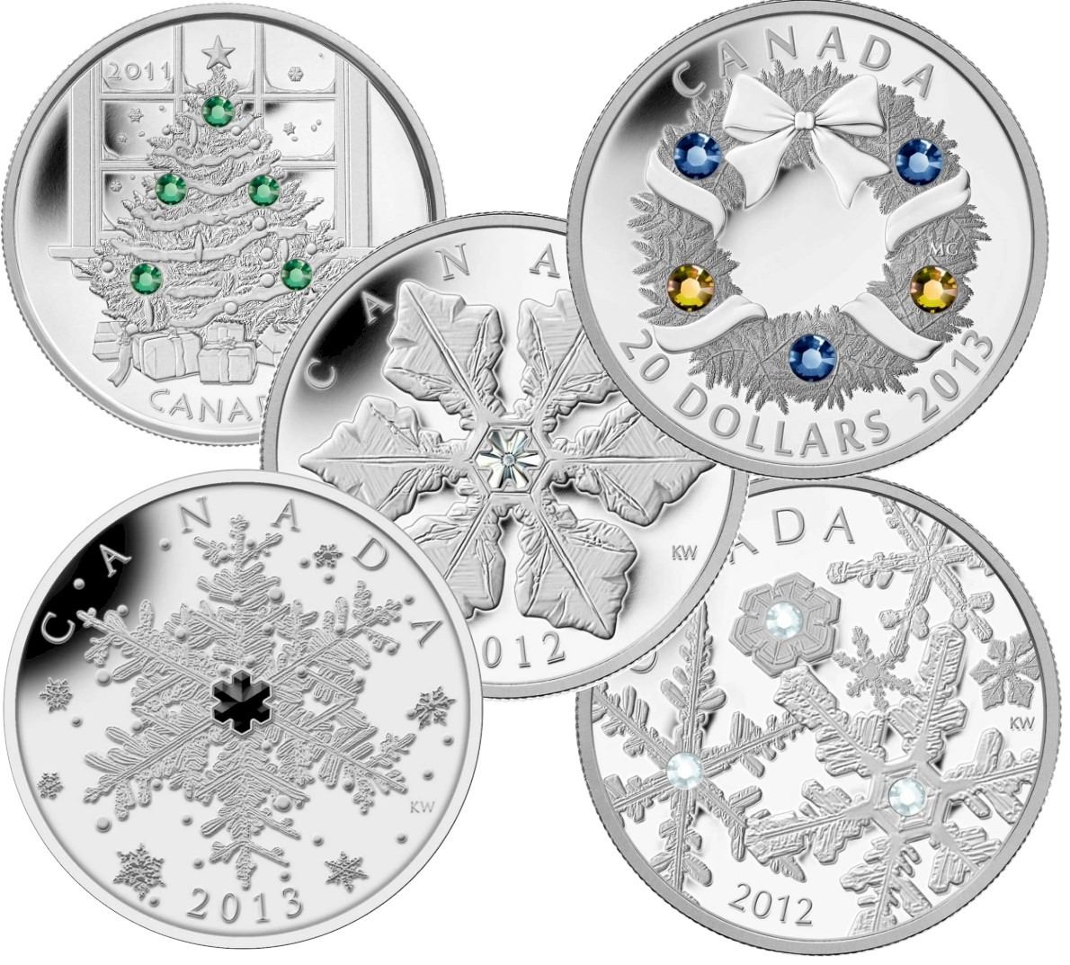2011 $20 Christmas Tree, 2012 $20 Holiday Snowstorm, Holiday Snowflake with Swarovski Crystal, 2013 Holiday Wreath & Winter Snow