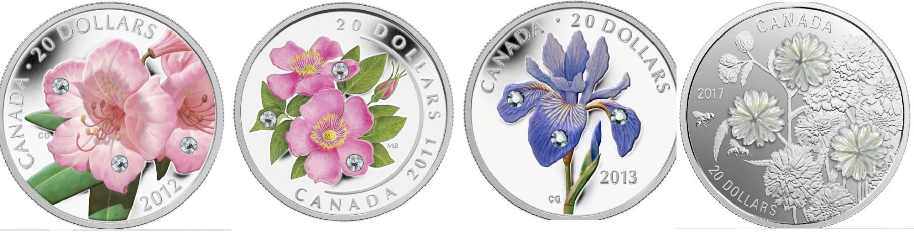 2011 $20 Fine Silver Coin- Rose, 2012 Rhododendron, 2013 Iris versicolor, and 2017 Pearl Flowers, lo