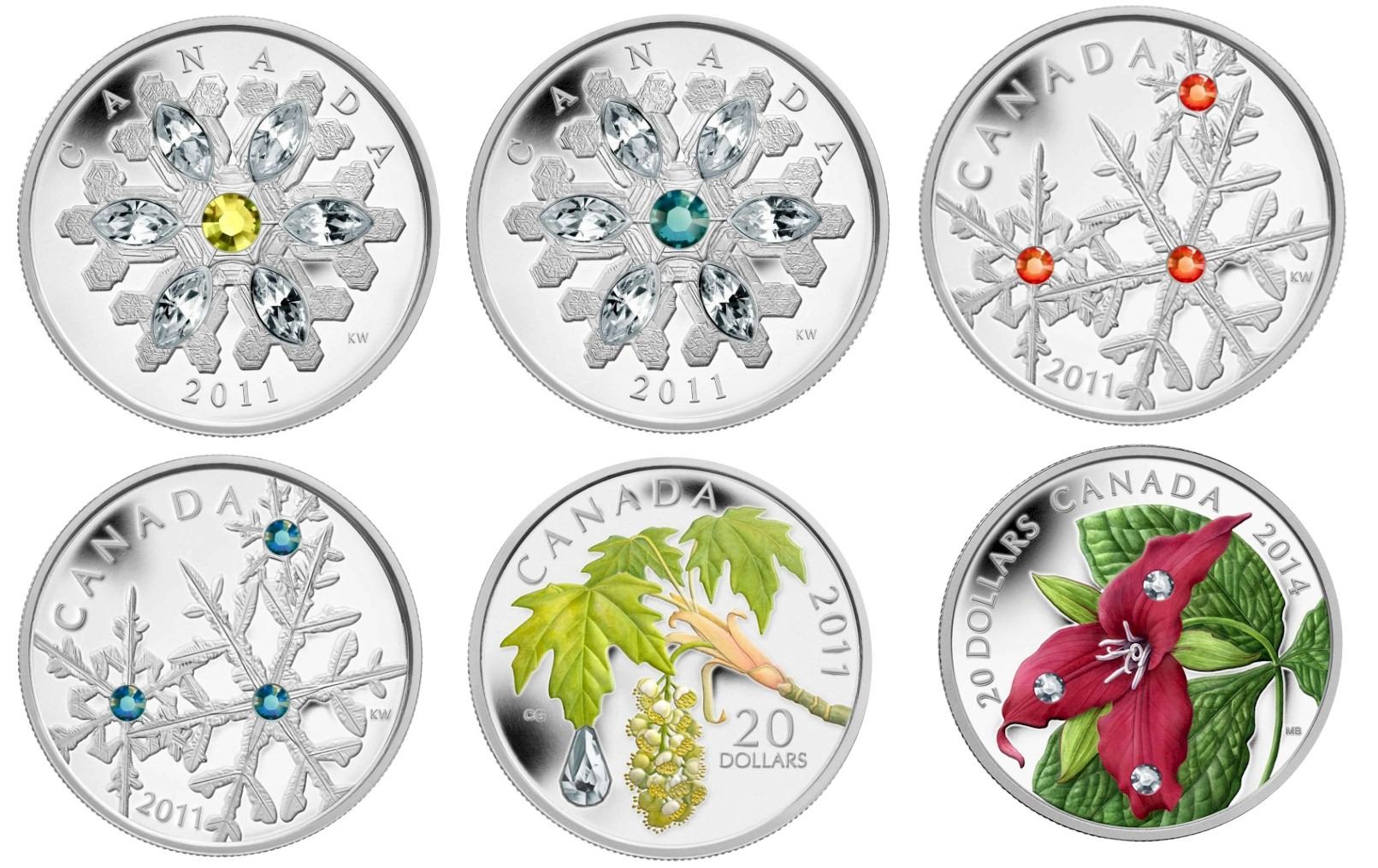 2011 $20 Topaz Crystal Snowflake, Emerald Crystal Snowflake, Hyacinth Red Small, Montana Blue Small, Maple Leaf Crystal Raindrop