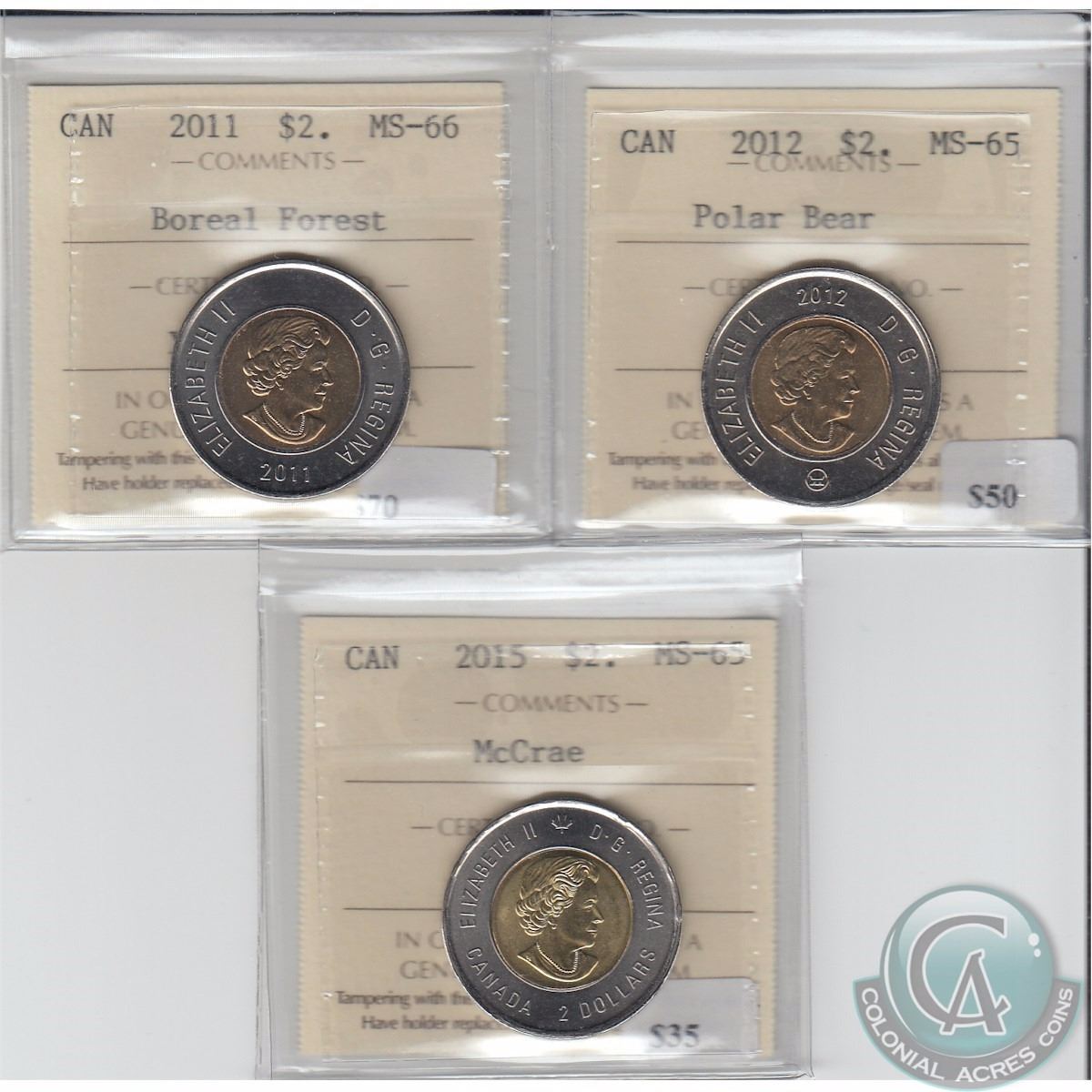 2011, 2012 & 2015 Canada $2 All ICCS Certified Coins. This lot includes the 2011 Boreal Forest $2 MS-66, 2012 Polar Bear $20 MS-65 and the 2015 John McCrae $2 MS-65 (3pcs)