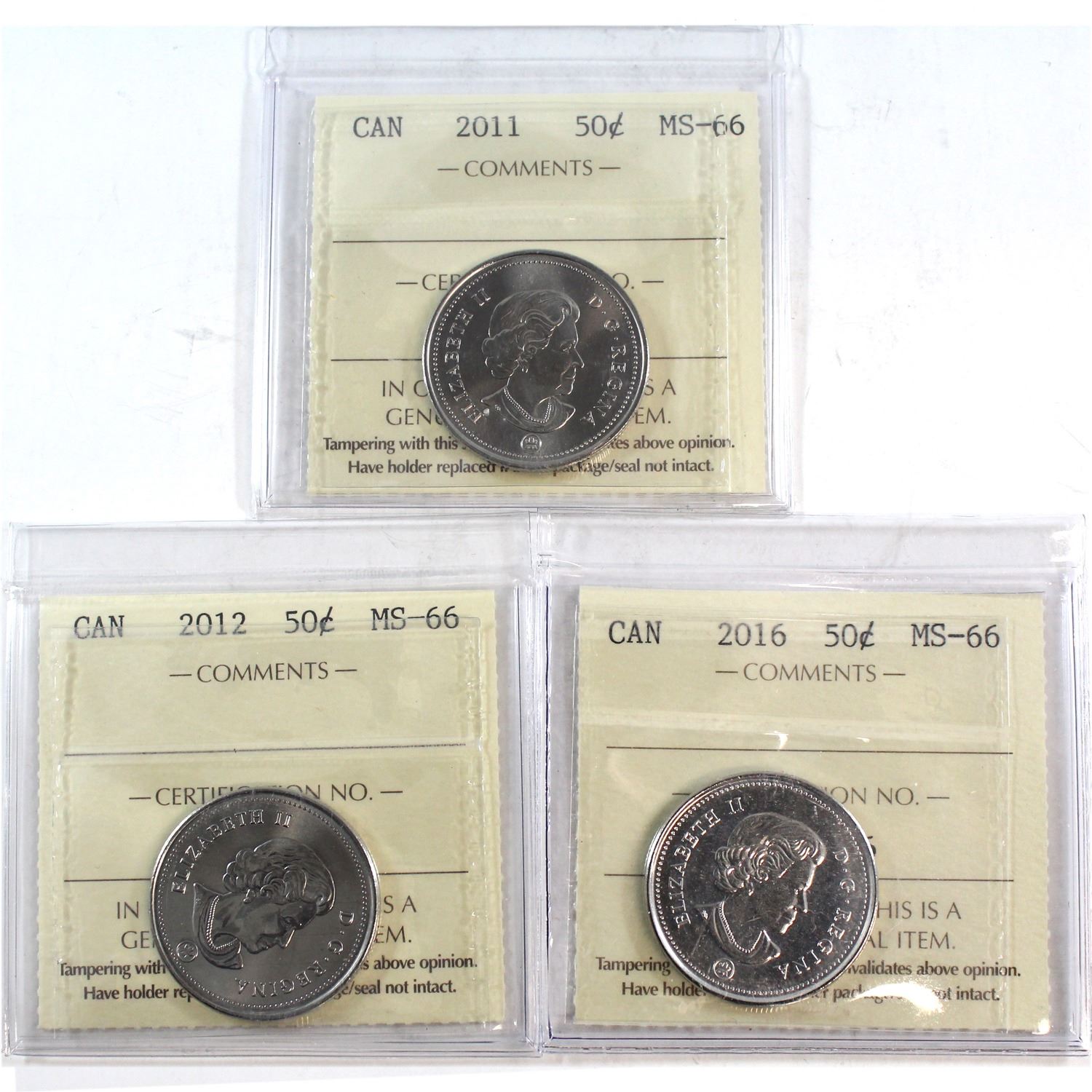 2011, 2012 & 2016 Canada 50-cent ICCS Certified MS-66. 3pcs