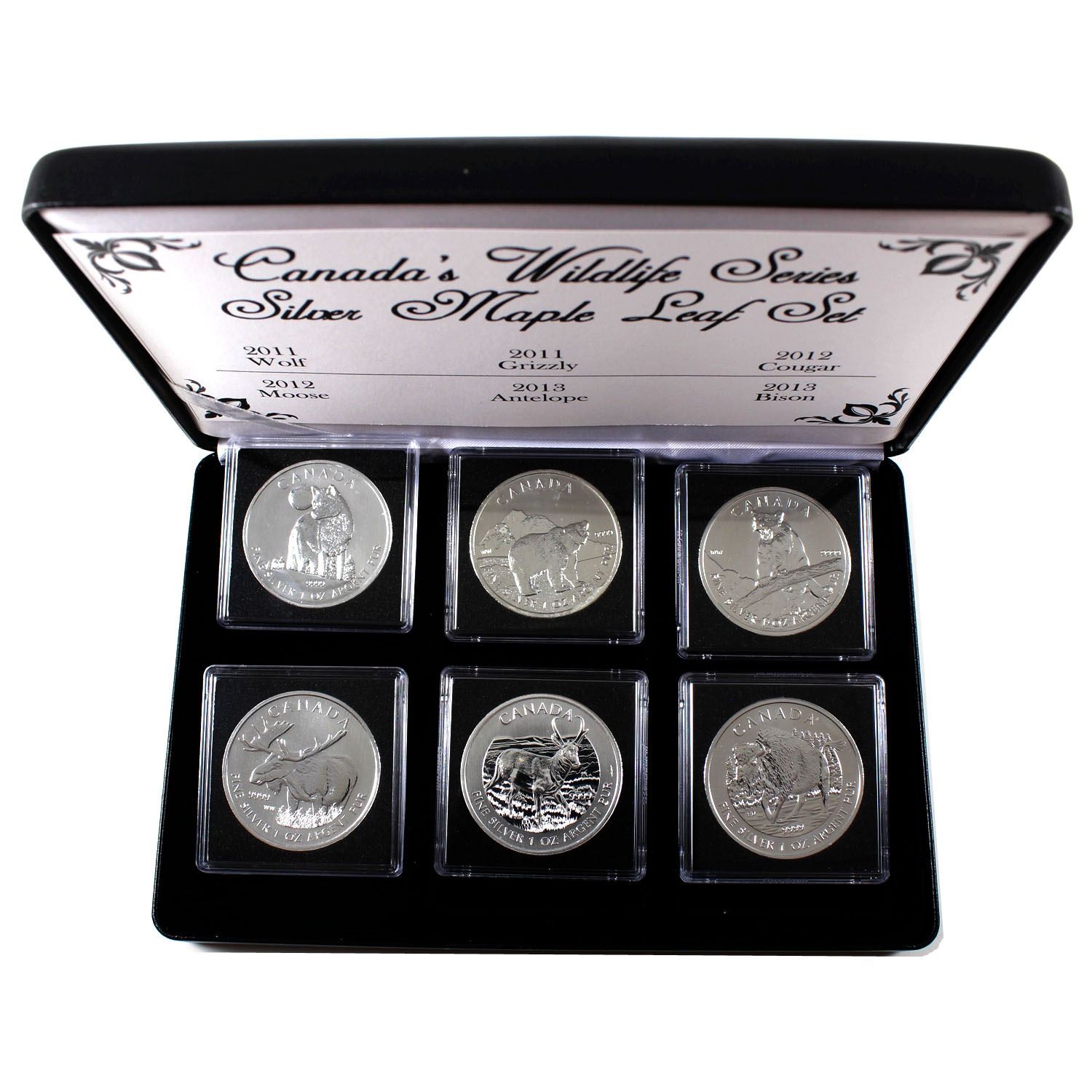 2011-2013 Canada $5 Wildlife Series 1oz .9999 Fine Silver Maple Leaf Set Encapsulated in Black Display Box - 2011 Wolf, 2011 Grizzly, 2012 Cougar, 2012 Moose, 2013 Antelope & 2013 Bison. 6pcs (TAX Exempt)