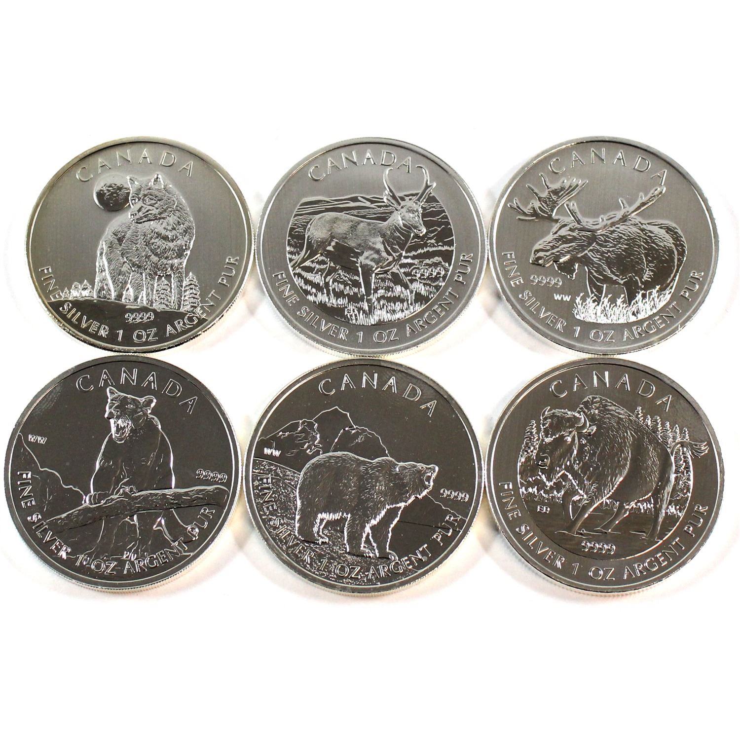 2011-2013 Canada 6-Coin 1oz Wildlife Series Fine Silver Coin Set (Tax Exempt). This set includes the: 2011 Wolf, 2011 Grizzly, 2012 Moose, 2012 Cougar, 2013 Bison and the 2013 Antelope. 6pcs.