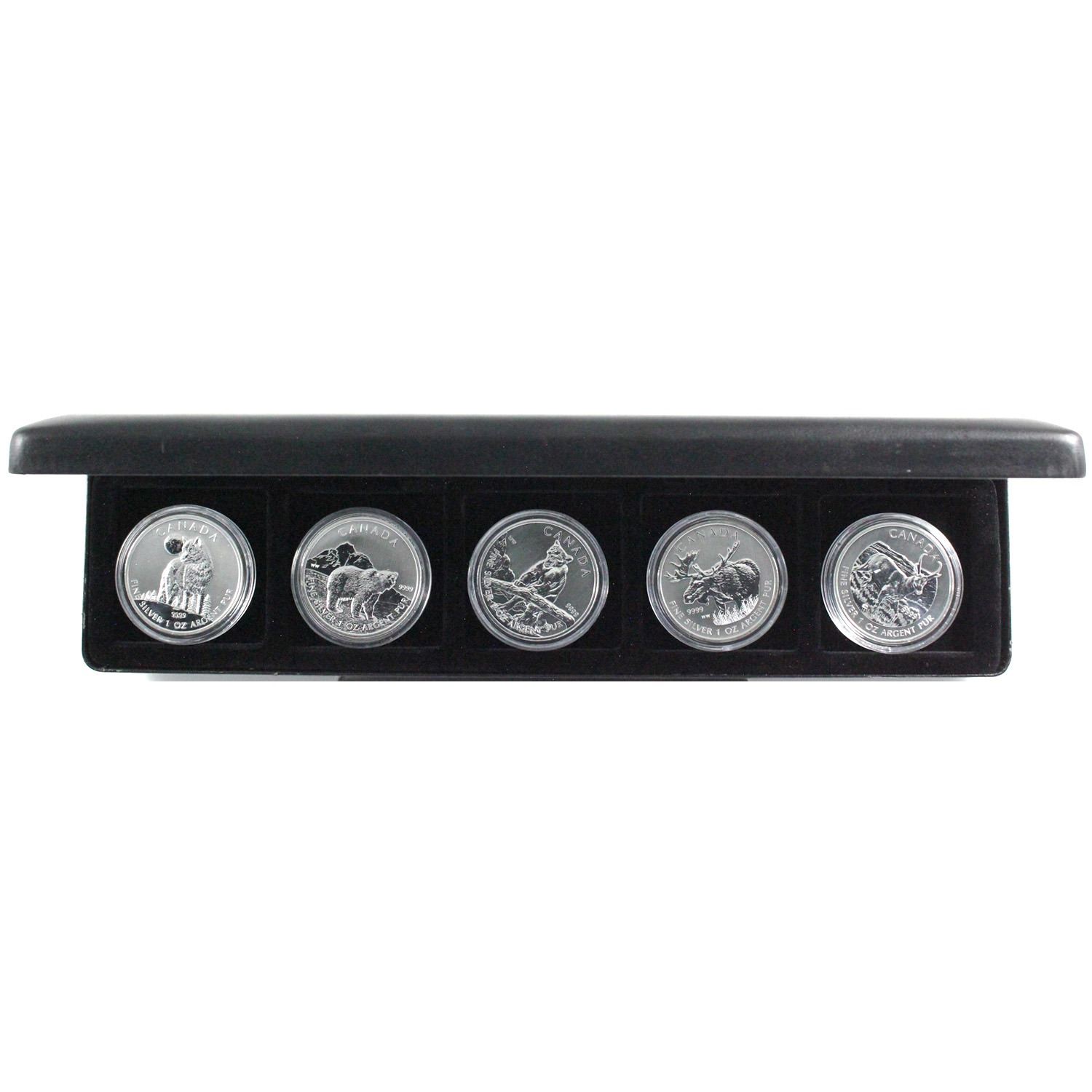 2011-2013 Canada Wildlife Series 1oz .9999 Fine Silver Coins Encapsulated in Black Display Box - 2011 Wolf, 2011 Grizzly, 2012 Moose, 2012 Cougar & 2013 Antelope (coins may have light toning & display box lightly worn). 5pcs (TAX Exempt)