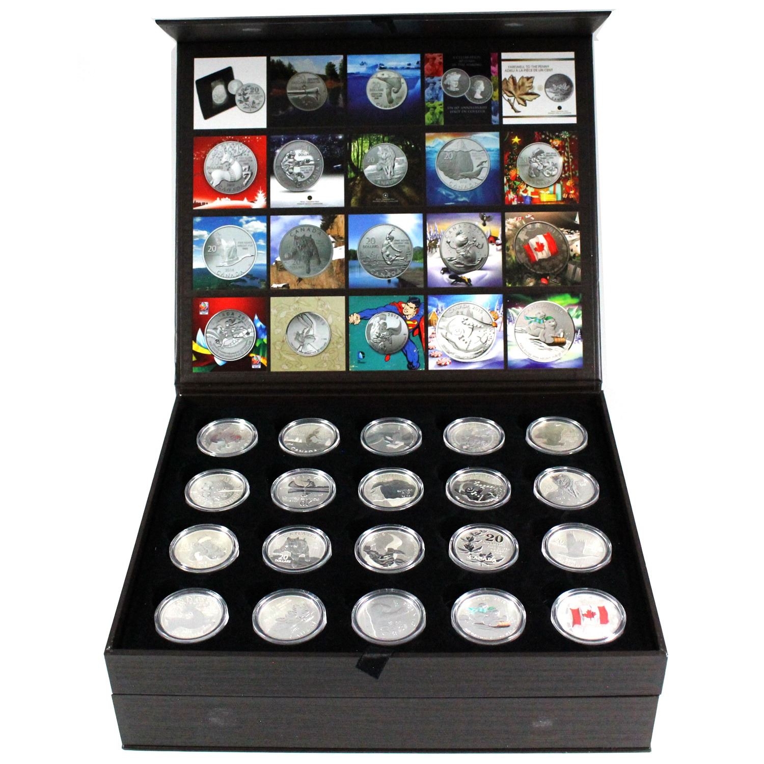 2011-2015 Canada $20 For $20 & $25 For $25 Fine Silver Coins in Deluxe Display Case with Spot for Sleeves (17 out of 20 sleeves included). You will receive 18x $20 & 2x $25 coins. See picture for variety. (TAX Exempt)