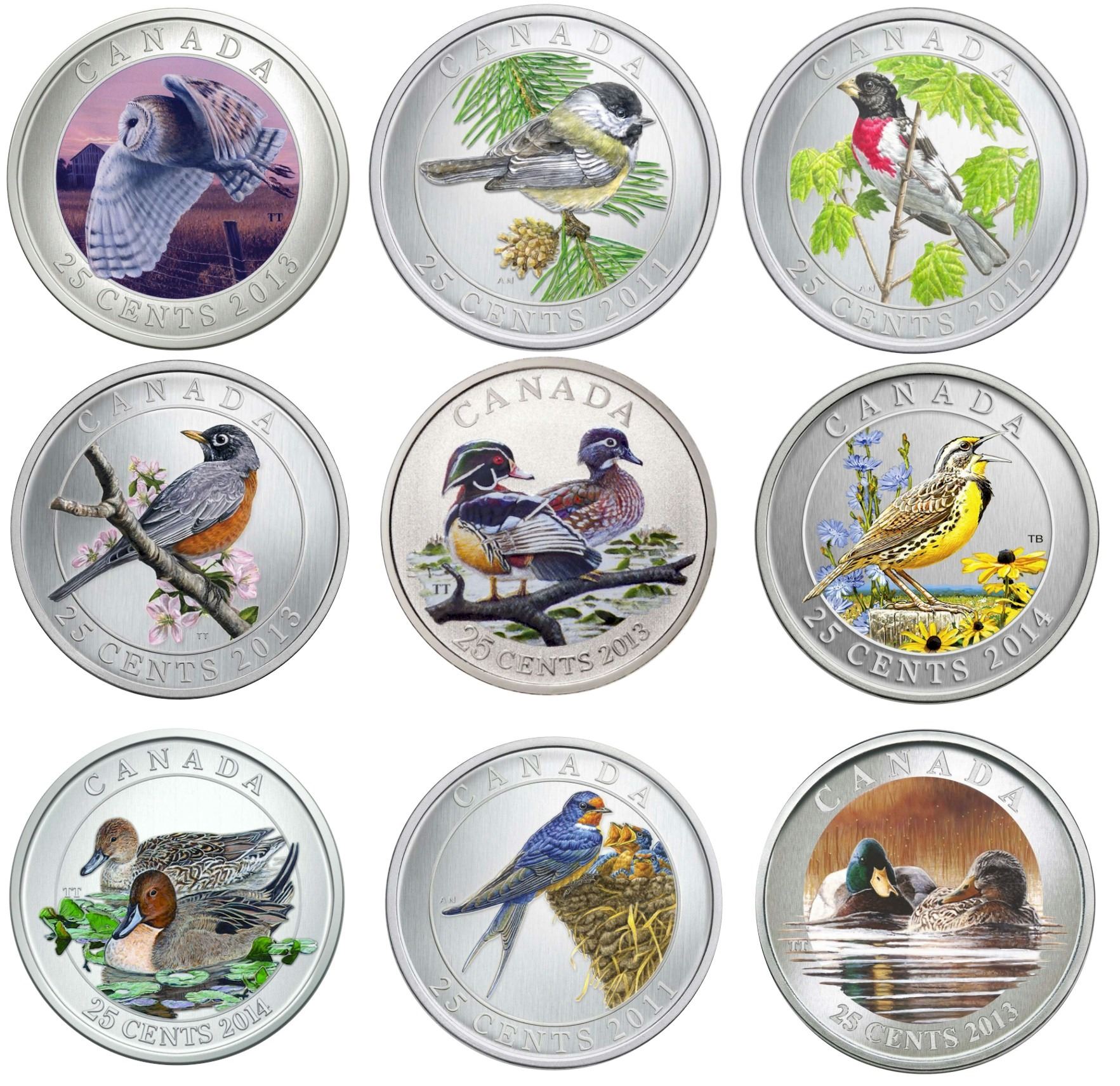 2011 25¢ Barn Swallow, Black Capped Chickadee, 2012 Rose Breasted Grosbeak, 2013 Wood Duck, Barn Owl, American Robin, Mallard, 2