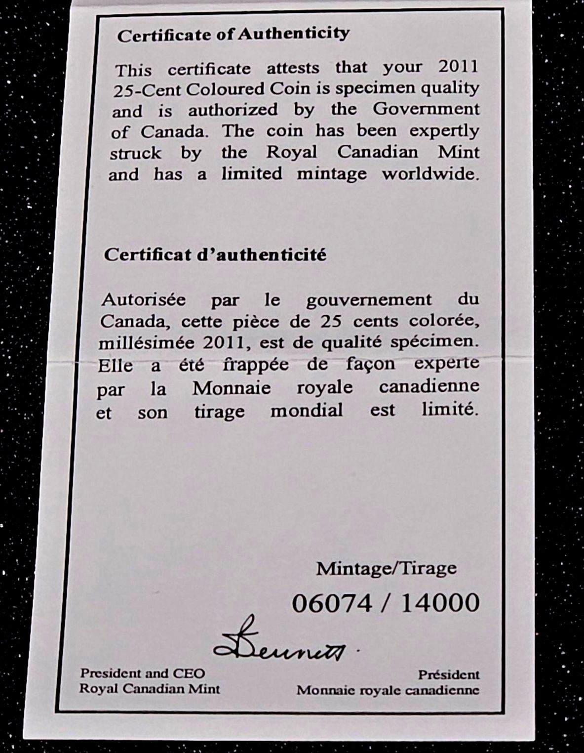 Birds are an ever-popular theme that comes alive in vibrant colour on this 2011 extra-large 25-cent coin. It measures a full 35 mm across its diameter, with plenty of space to showcase its endearing detailed design. Mintage is 06074/14000.