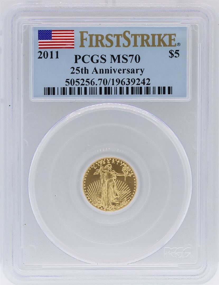 One 2011 $5 PCGS MS70 25th Anniversary First Strike American Eagle Gold Coin. PCGS Certified.