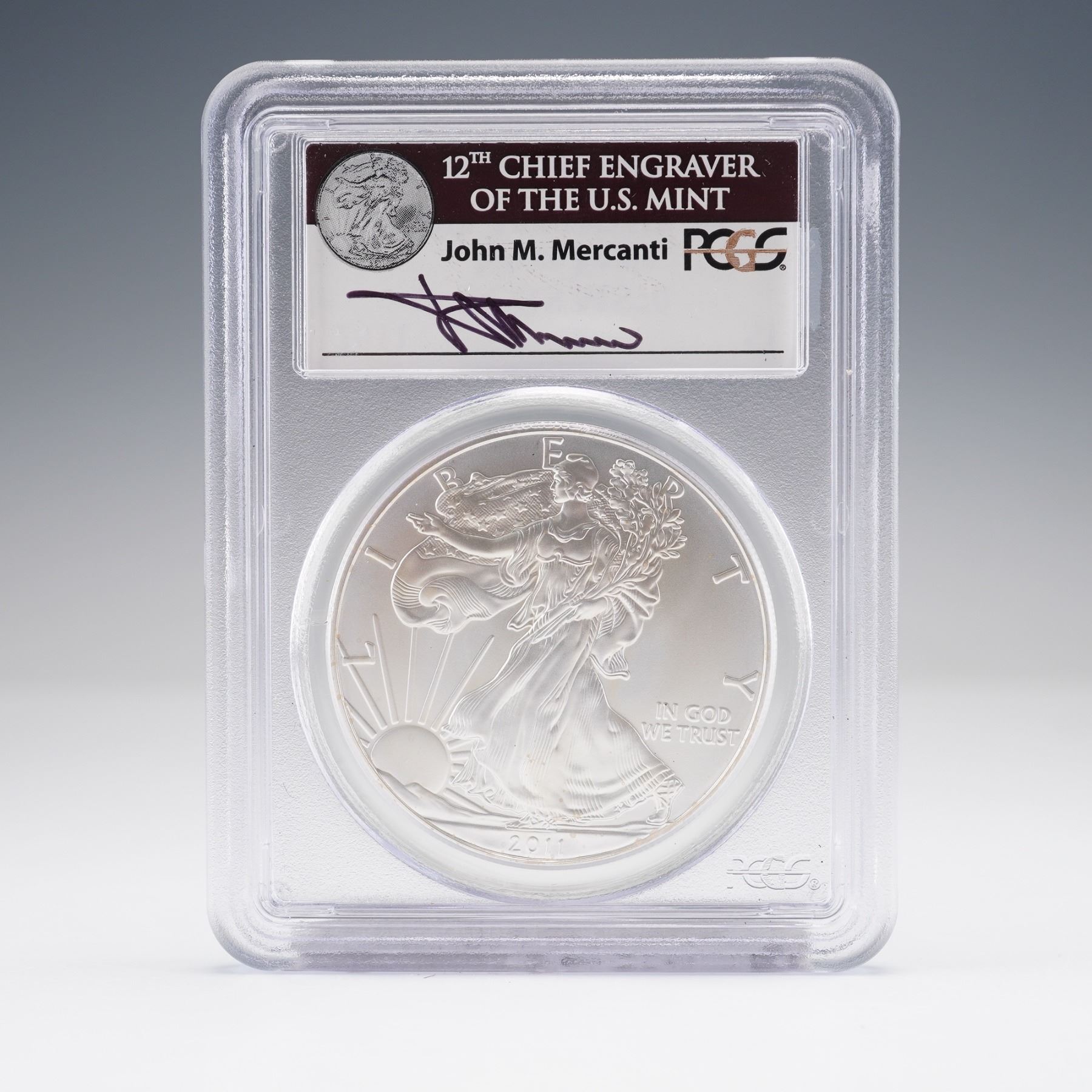 This 2011 American Silver Eagle one-dollar coin, struck in one troy ounce of .999 fine silver, commemorates the 25th Anniversary of the series and has been graded MS70 by the Professional Coin Grading Service. The obverse features the iconic Walking Liberty design, depicting Liberty draped in the American flag, carrying laurel and oak branches as the sun rises over the horizon, accompanied by the inscriptions LIBERTY, IN GOD WE TRUST, and the year of issue. The reverse displays the heraldic eagle design, with a shield at its breast, an olive branch in its right talon, and arrows in its left, surrounded by thirteen stars and the inscriptions UNITED STATES OF AMERICA, 1 OZ. FINE SILVER - ONE DOLLAR. Encapsulated and certified by PCGS for authenticity and preservation.