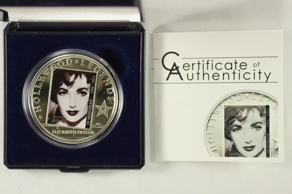 ELIZABETH TAYLOR COLORIZED SILVER PROOF, ORIGINAL MINT PACKAGING, MINTAGE OF ONLY 2011 PIECES