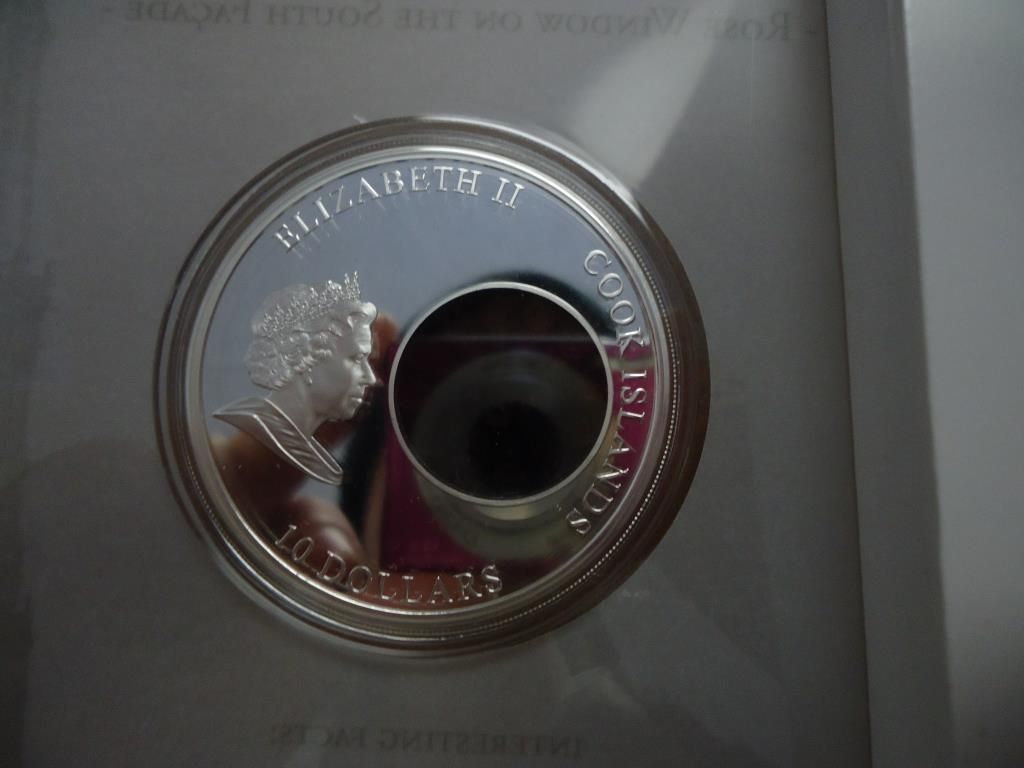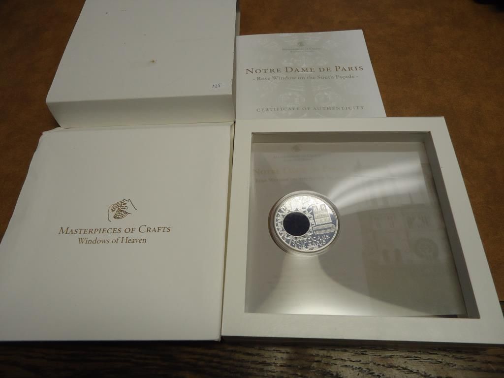 NOTRE DAME DE PARIS, ROSE WINDOW ON THE SOUTH FACADE, HAND CUT AND COLORED GLASS INSERT, MINTAGE OF ONLY 2000, ORIGINAL MINT PACKAGING, YOU CAN SEE THROUGH THE COIN