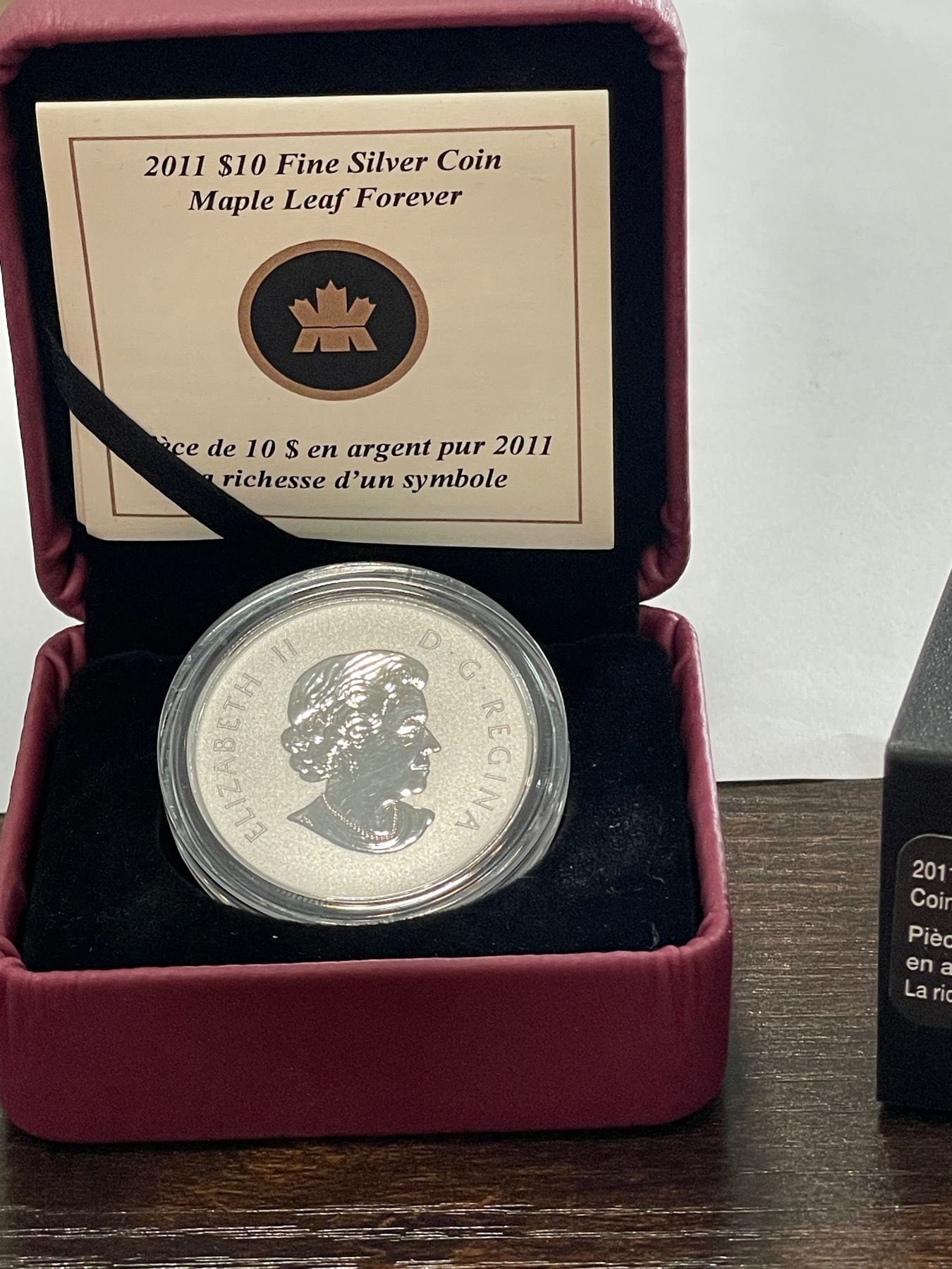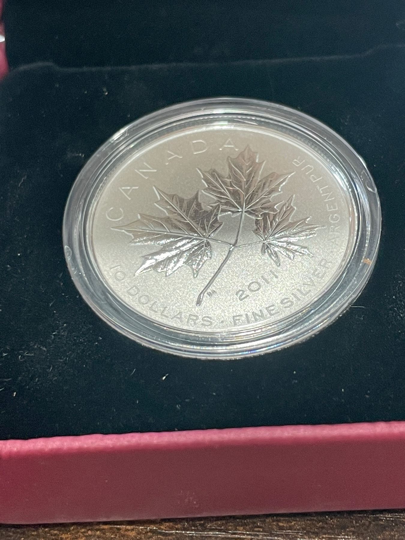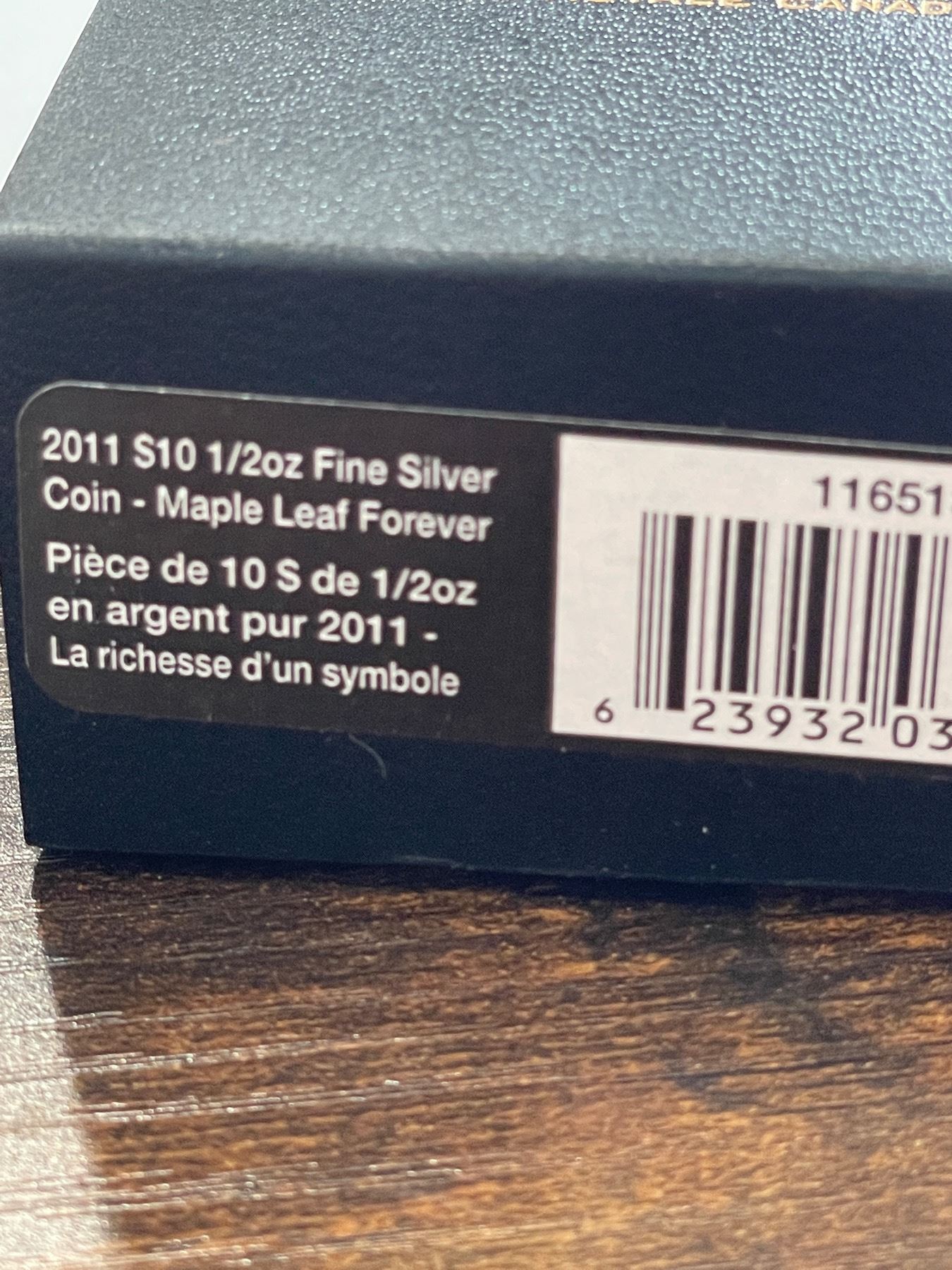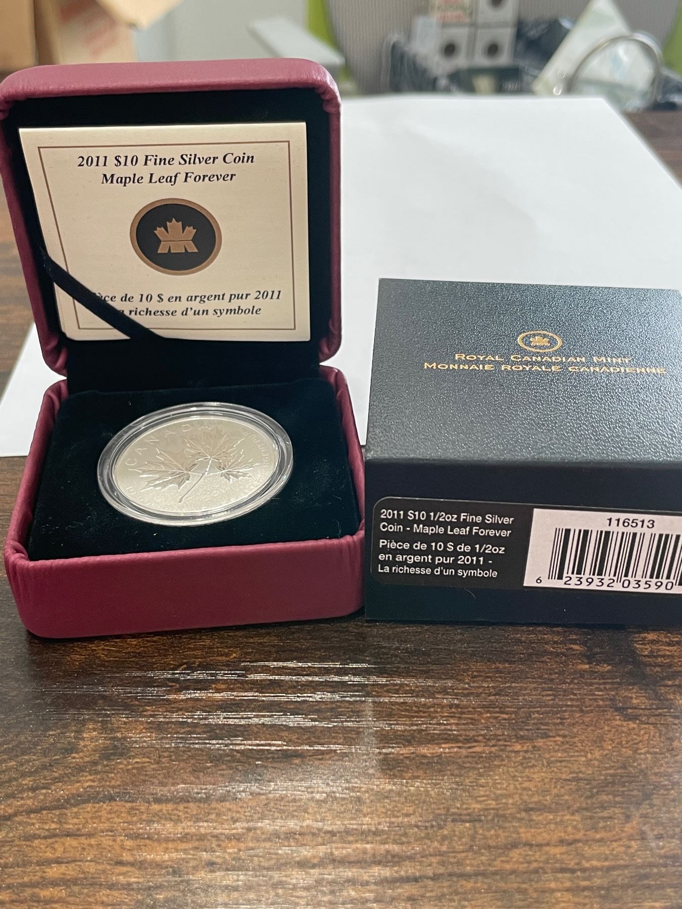 Commemorative silver maple leaf in box from 2011. Minted in .9999 fine silver with weight of 1/2oz